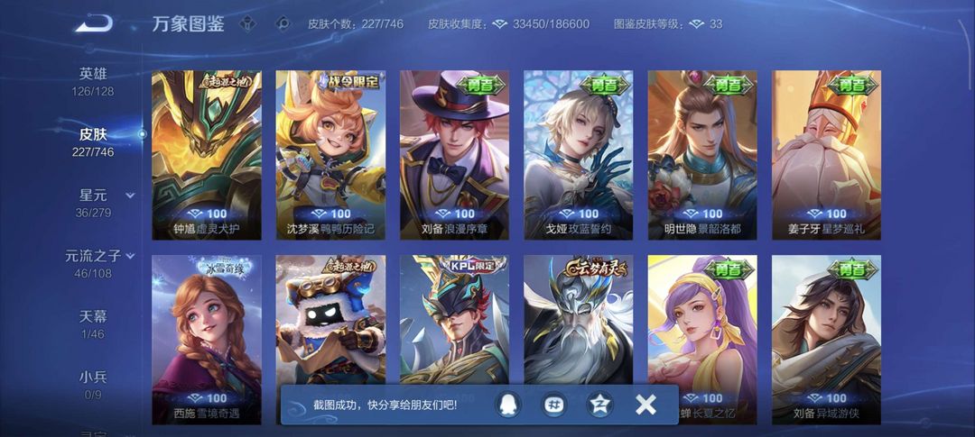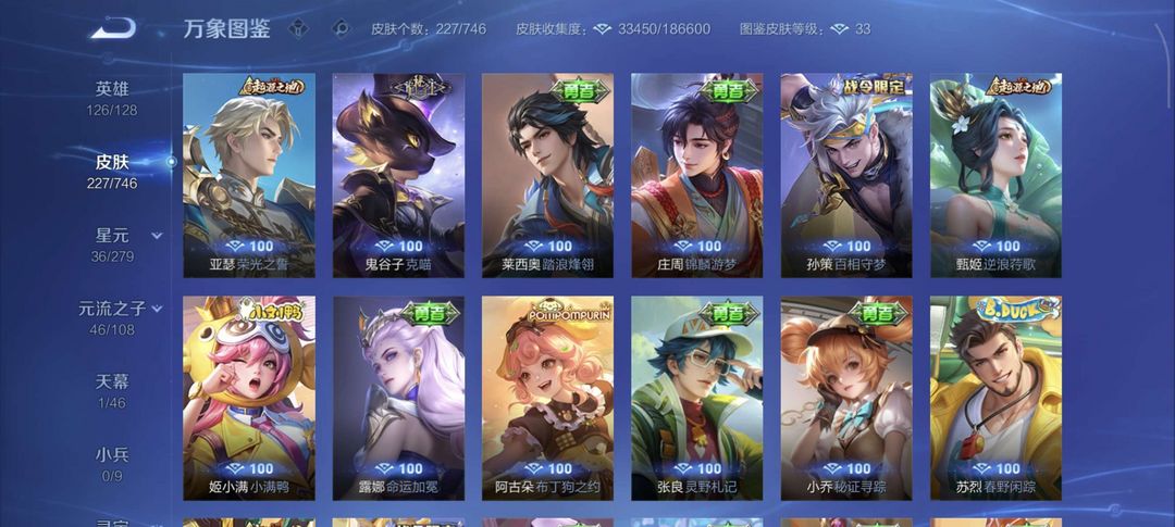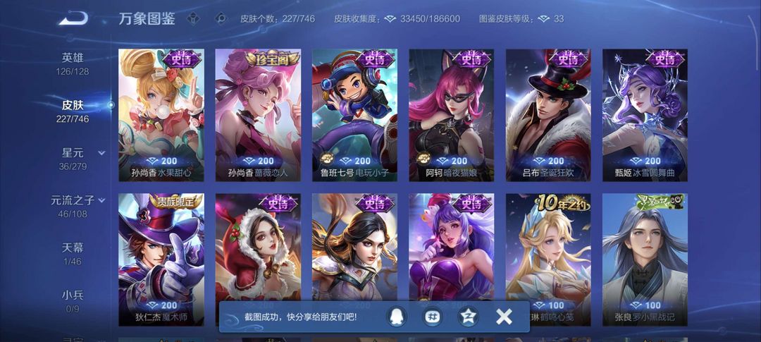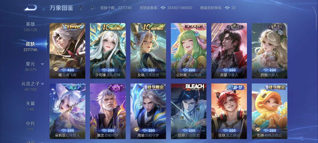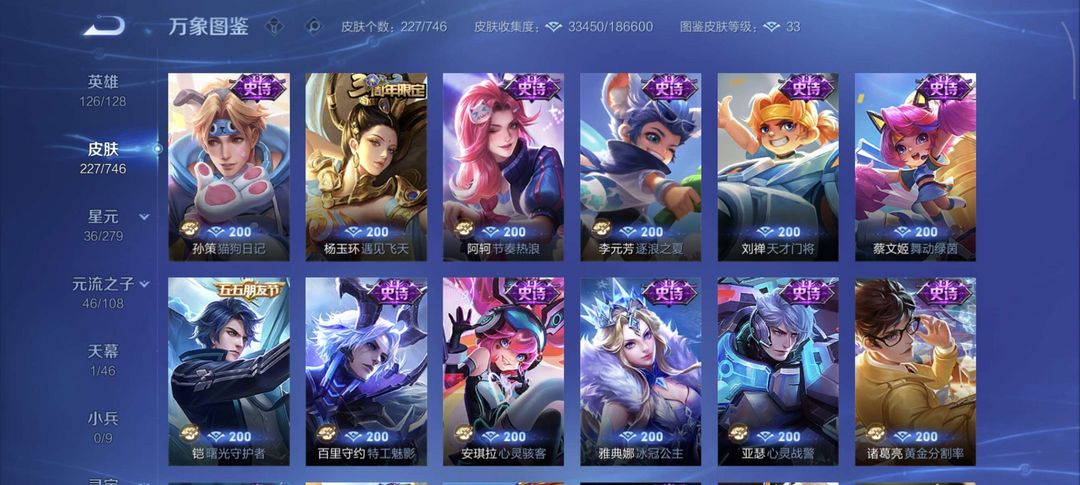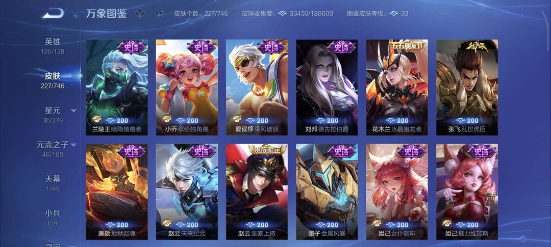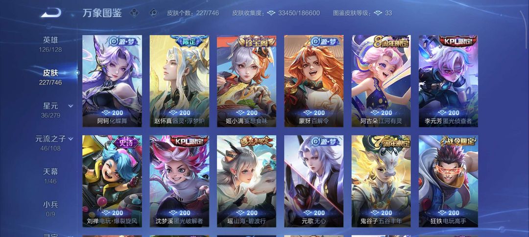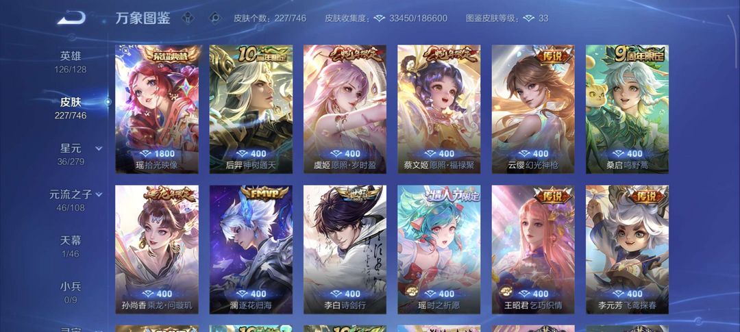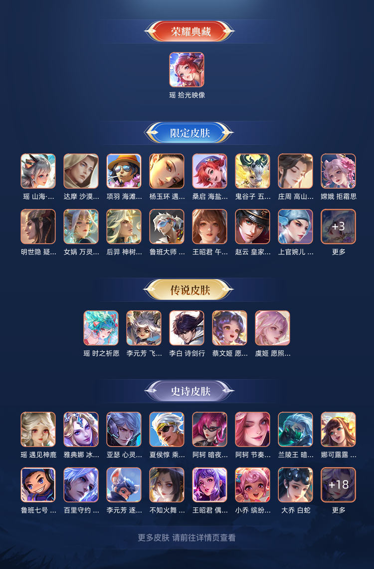 瑶荣耀典藏、情限➕虞姬、蔡文姬、孙尚香年限➕云缨、王昭君、李元芳传说皮➕澜逐花归海➕李白诗剑行。