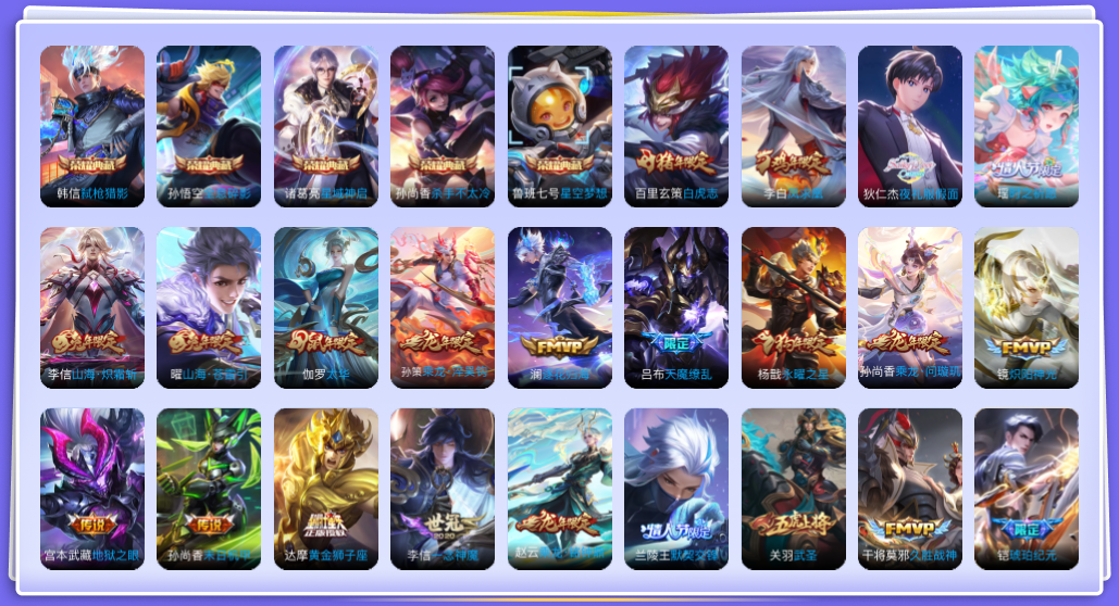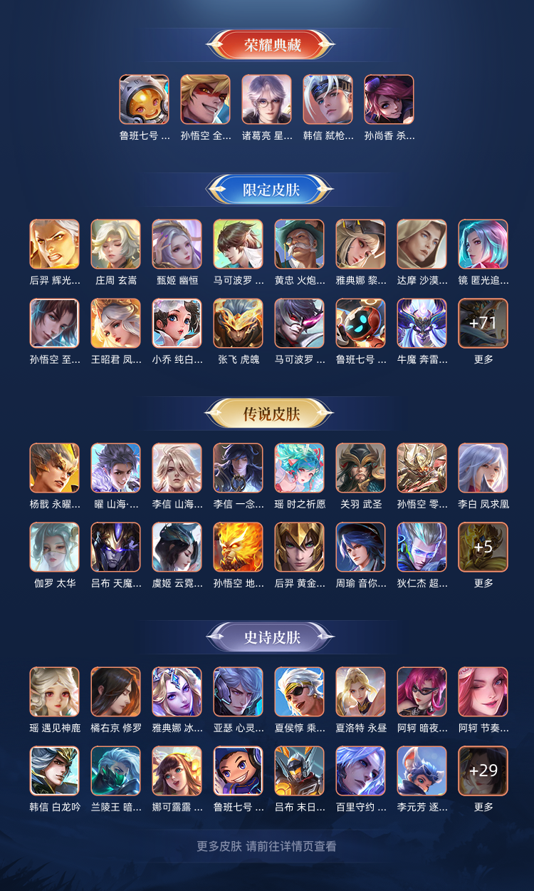 装备描述:武则天,星空梦想,杀手不太冷,全息碎影,星域神启,弑枪猎影 传说皮: 黄金狮子座,黄金射手座,冠军飞将,久胜战神,炽阳神光,一念神魔,云霓雀翎,末日机甲-孙尚香,地狱火,零号·赤焰,地狱之眼,音你心动-周瑜,胖达荣荣,时之恋人-刘备,超时空战士-狄仁杰,山海·炽霜斩,山海·苍雷引,夜礼服假面,澜逐花归海,艾琳觅芳踪,琥珀纪元铠,乘龙·问璇玑,乘龙·铭钟鼎,乘龙·淬吴钩 限定皮: 冰锋战神,遇见飞天,李小龙,奔雷神使,游园惊梦,梁祝,御风骁将,引擎之心,武圣,烈魂,魔法小厨娘,辉光之辰,玄嵩,岱宗,虎魄,天魔缭乱,永曜之星,幽恒,时之彼端,飞衡,乒乒小将,太华,逐梦之音,逐梦之翼,天狼狩猎者,逐梦之星,逐梦之影,热情桑巴,逐梦之光,天狼绘梦者,凤求凰,寅虎·御盾,白虎志,青龙志,瑞麟志,玄武志,朱雀志,凤凰于飞,纯白花嫁,至尊宝,默契交锋-兰陵王,真爱至上,如梦令-后羿,大圣娶亲,默契交锋-花木兰,霸王别姬-项羽,霸王别姬-虞姬,高山流水,孙行者,猪悟能,匿光追影者,傲雪梅枪,时之祈愿-云中君,时之祈愿-瑶,百木心枪,五谷丰年,山海·玄木吟