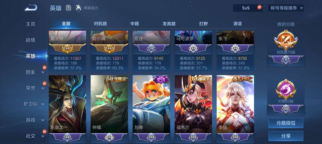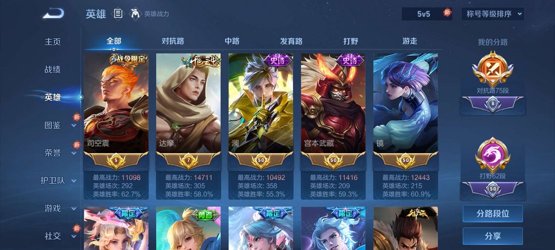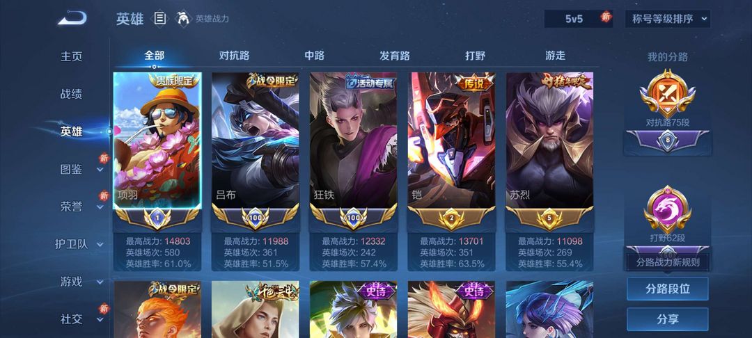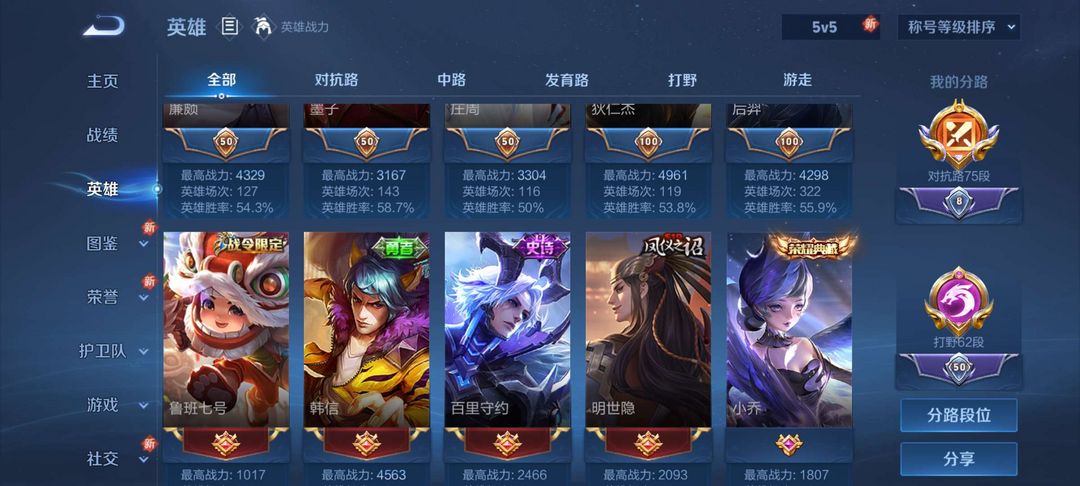 历史3小国多省标,75段对抗,62段打野,多皮肤