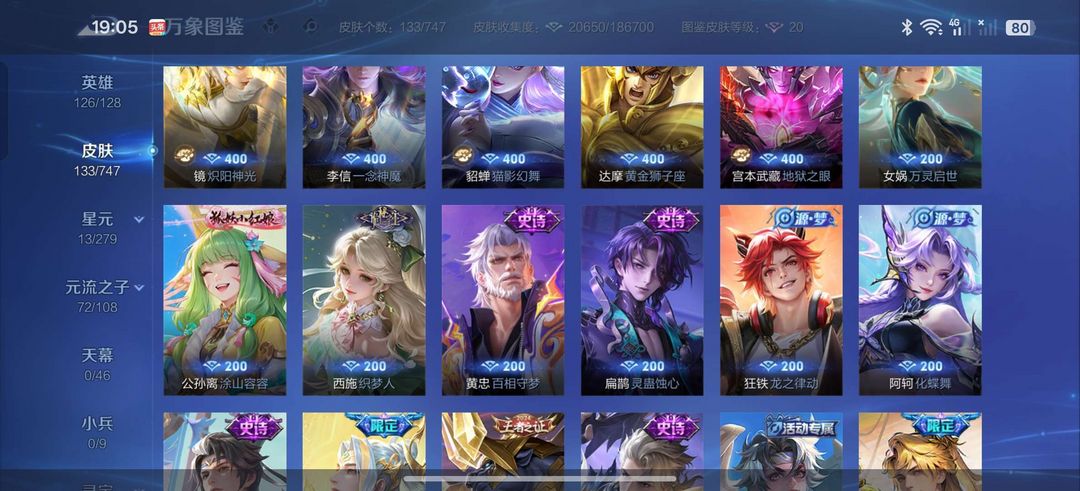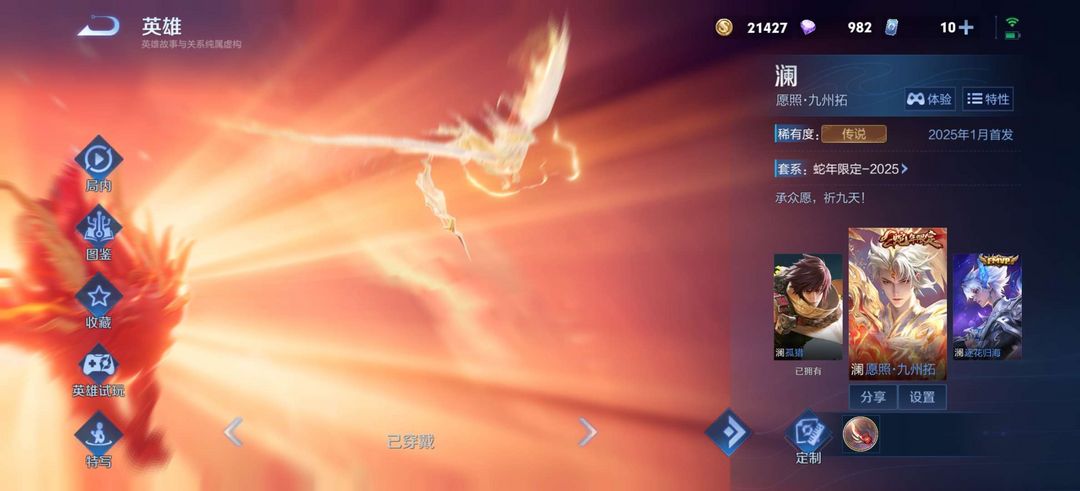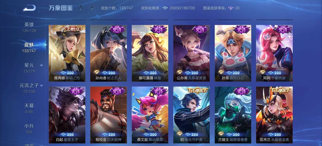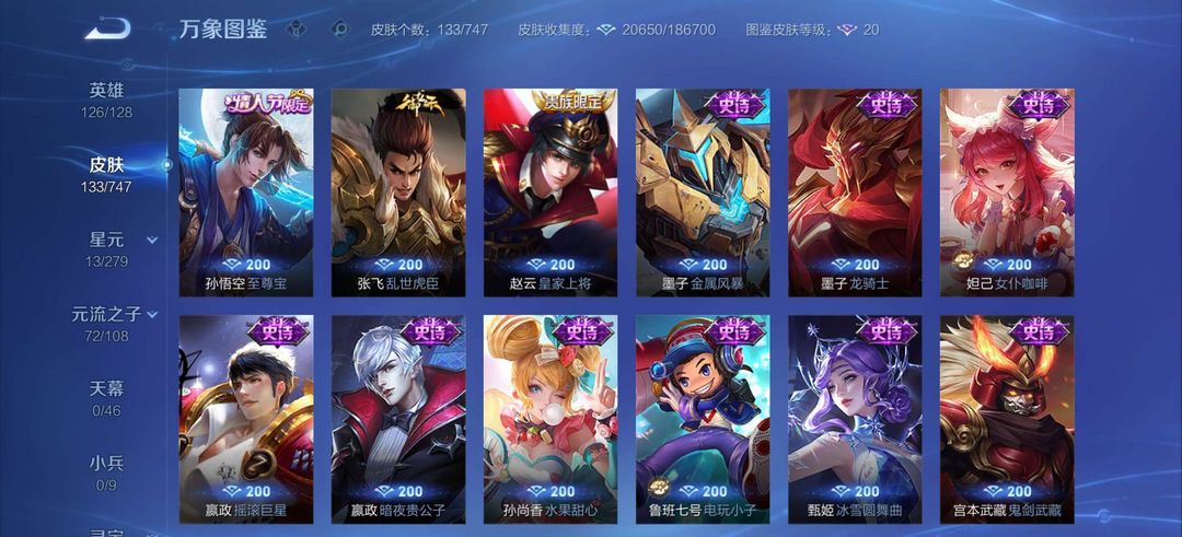 装备描述:至尊宝,澜的蛇年限定,韩信的群星魔术团,寅虎,马可怪盗基德,敖隐