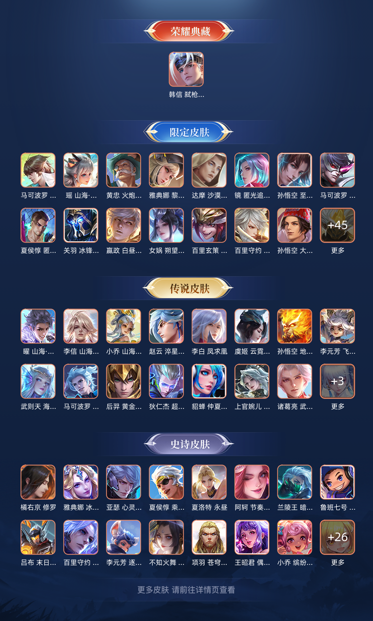 有韩信的荣耀典藏,而且铭文都是满的全英雄几乎每一个英雄都会有皮肤