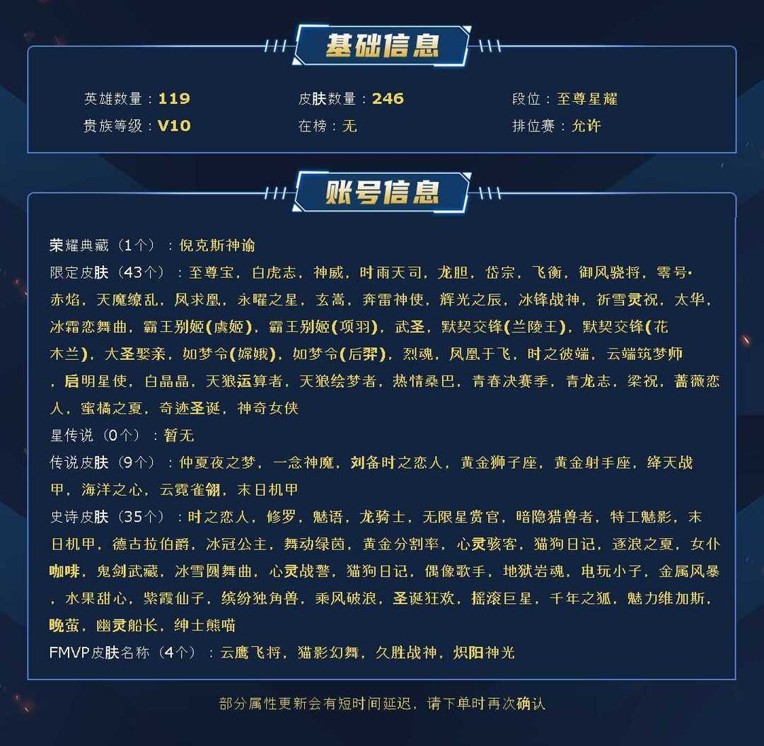 限制: 租号10次及以上 |装备描述:毁号,涉及毁坏虚拟财产罪及计算机安全罪,请文明游戏素质游戏,让我们共建美好租号平台 本游戏账号: V8用户基础段位:永恒钻石IV英雄多皮肤多。典藏皮肤3个感受典藏皮肤带来的优质体验快感 私人所属英雄皮肤有:孙悟空 全息碎影夏侯惇 无限飓风号小乔 天鹅之梦赵云 淬星耀世虞姬 启明星使吕布 天魔缭乱李白 凤求凰武则天 海洋之心后羿 黄金射手座杨戬 永曜之星诸葛亮 武陵仙君孙尚香 末日机甲孙悟空 地狱火等等 注意事项: A.游戏过程中请不要恶意挂机或者不文明发言B.恶意挂机、顶号等行为将被拉黑无法再次下单C.进入游戏后中途请勿退出登陆,否则无法再次上号D.部分账号由于异地登录可能会出现密码错误提示,通常再尝试5-6次后可上号。 喜欢本账号请点 ☆收藏☆ 方便下次租用,谢谢光临惠顾请游戏局内保持文明,防止禁言影响他人游戏,祝您玩得愉快!