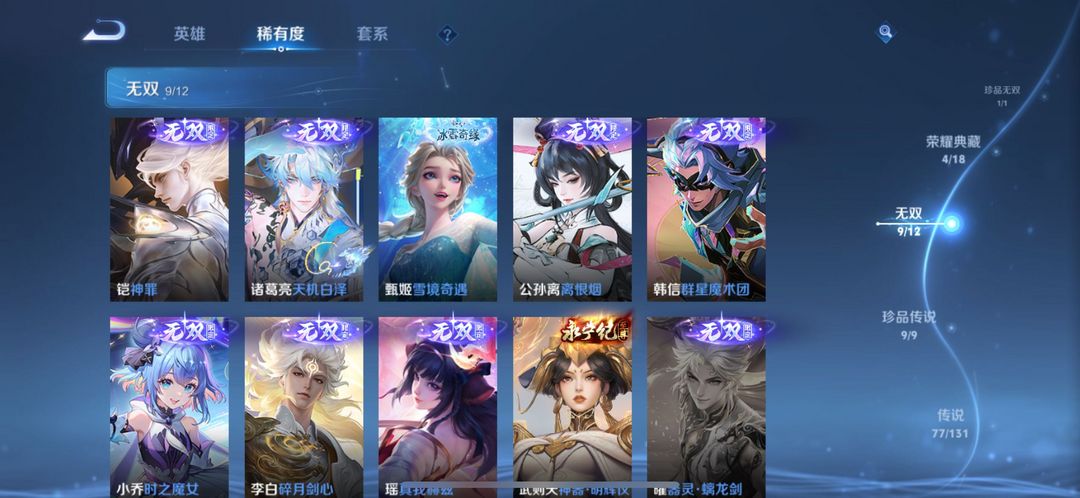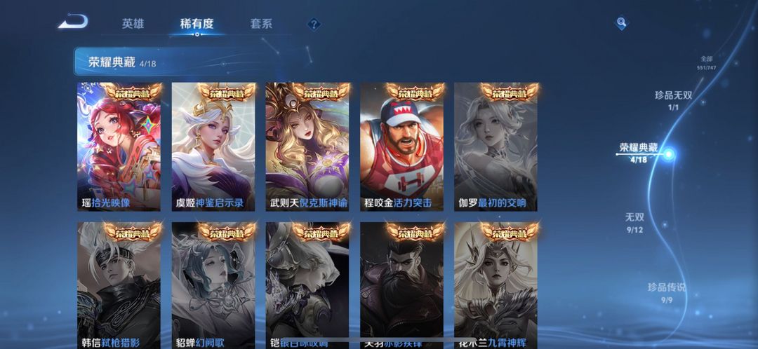 不禁言❤️荣耀V10 551皮 7水4典藏2小兵 1珍品无双 9无双凯 满珍品 多传说 12天幕