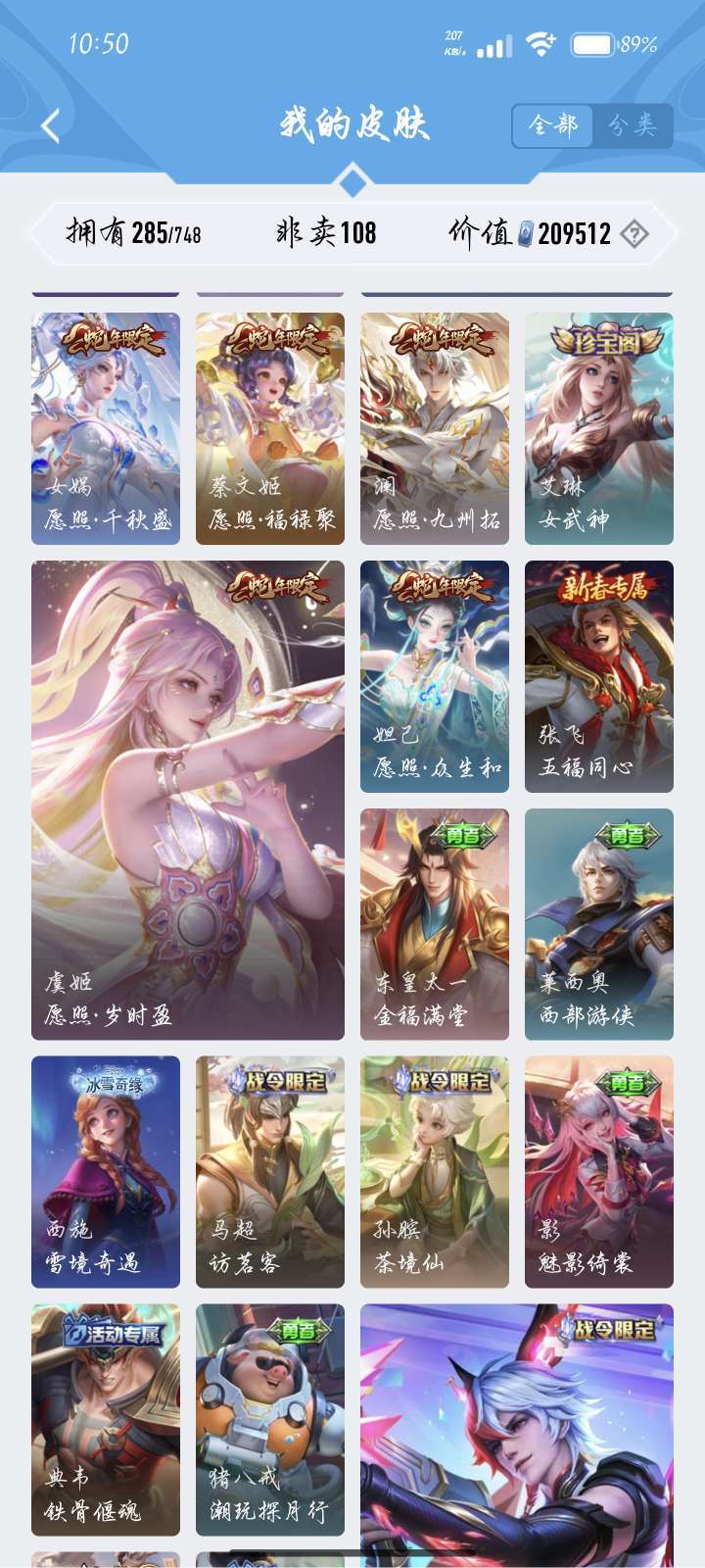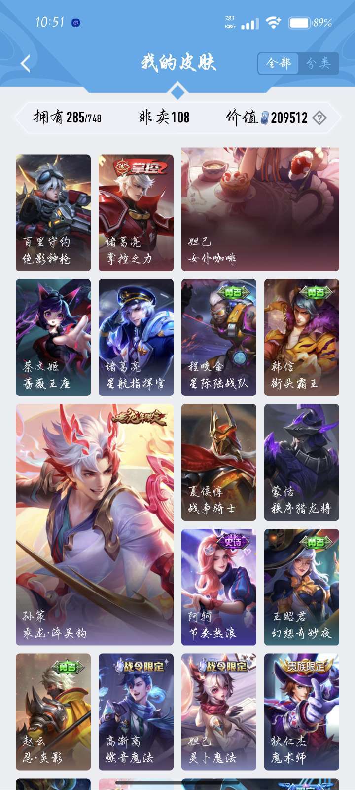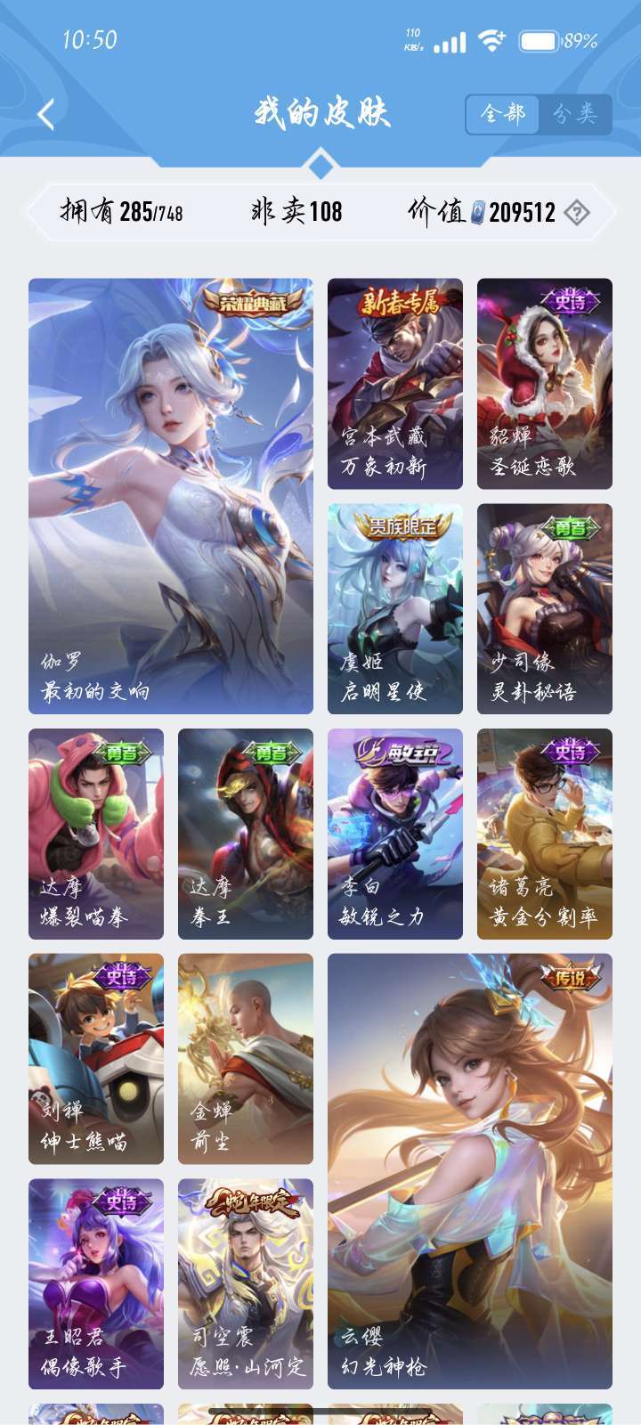 手Q 段位:最强王者 皮肤:285 英雄:127 荣耀典藏:伽罗 蛇年限定全 龙年限定:孙策