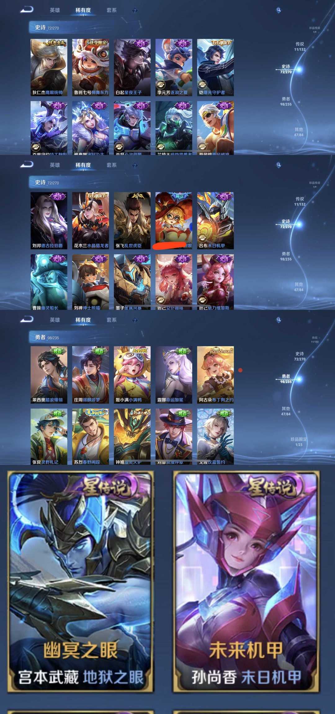 限制: 租号1次及以上 | 撤单率<49%才可租用此帐号装备描述:时间到了还登录白玩或者顶号全部改密拉黑处理永不解除,顶号机器会秒禁玩改密,顶号不仅拉黑还没得玩,赚三两块不容易,请理解谢谢。 ❤❤❤❤❤❤❤❤❤❤❤❤❤❤❤❤❤❤❤ 请勿开挂,挂机,送头,骂人,撤单后游戏等如有违规永久拉黑永不解除。 重置二级密码不要费劲了,号主每天都会上号查看,多行不义必自毙,人在做天在看,多做好事多自律,少做缺德事。 该号英雄128个皮肤230个,典藏1个,珍品传说1个,星传说2个,传说11个,史诗72个,祝您游戏愉快~