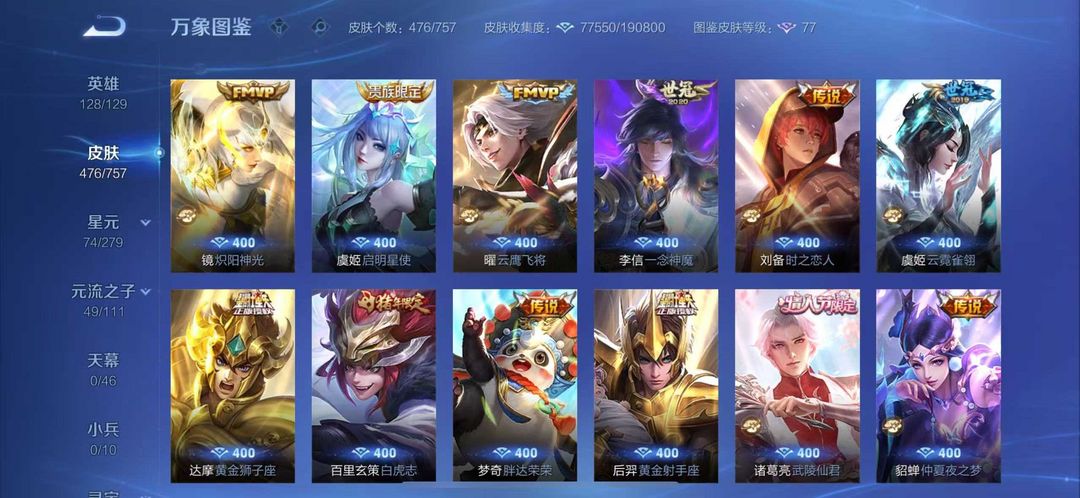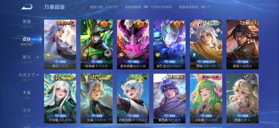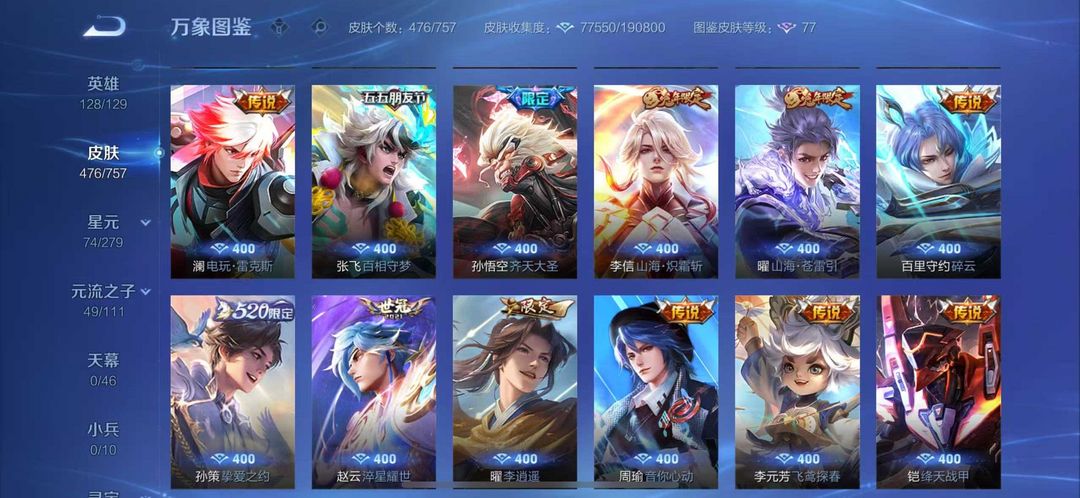 极品皮肤号476皮肤3水晶2无双皮❤️猴子无相无双皮❤️35传说皮❤️十周年限定李逍遥白虎志等超多皮