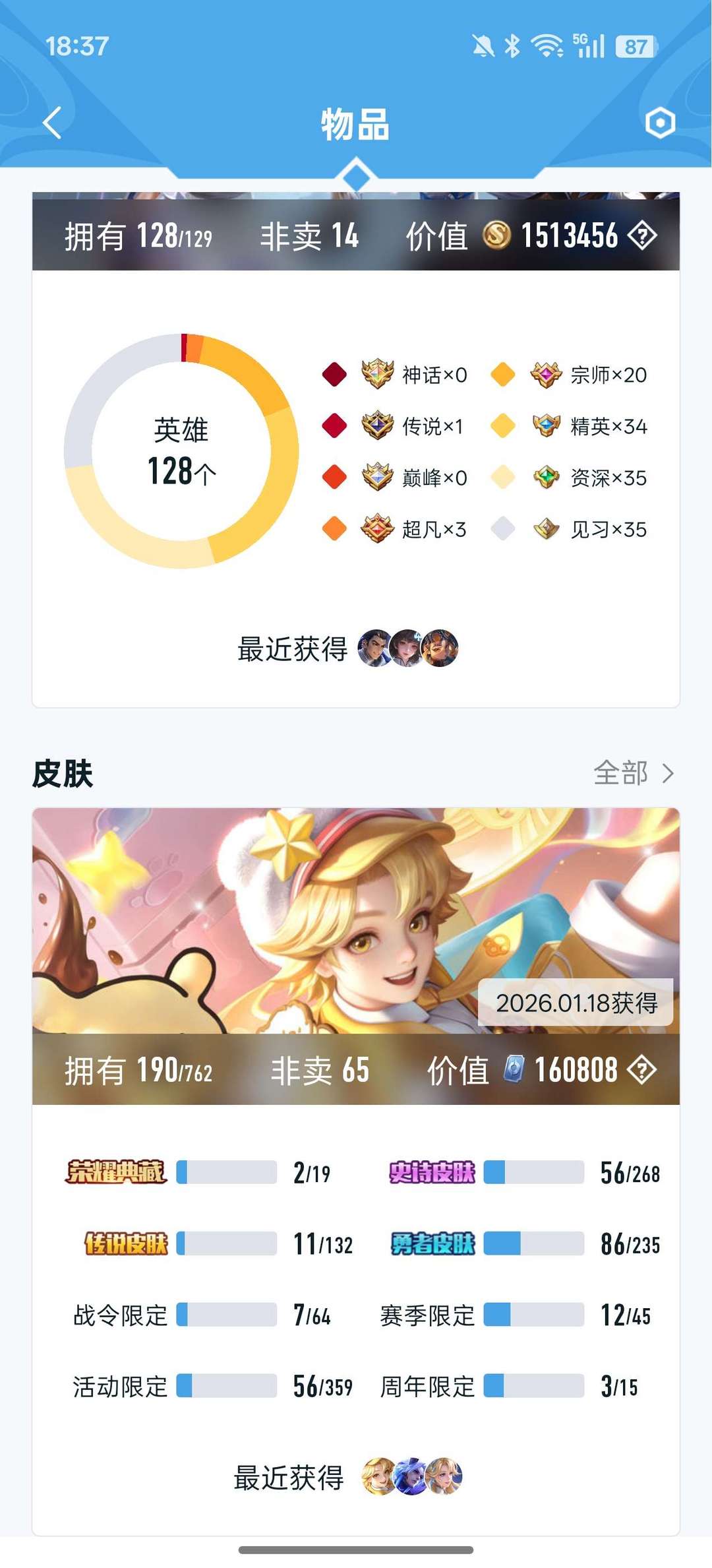 2个荣耀典藏凯和李白的,11个传说皮56个史诗皮190个皮肤,可玩已有的所有角色