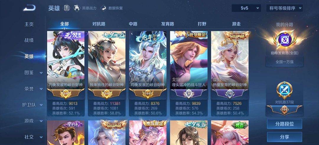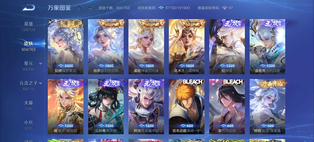 504皮128英雄,100级大师收藏家,坐拥多款荣耀典藏,公孙离全皮离恨烟、铠等无双限定