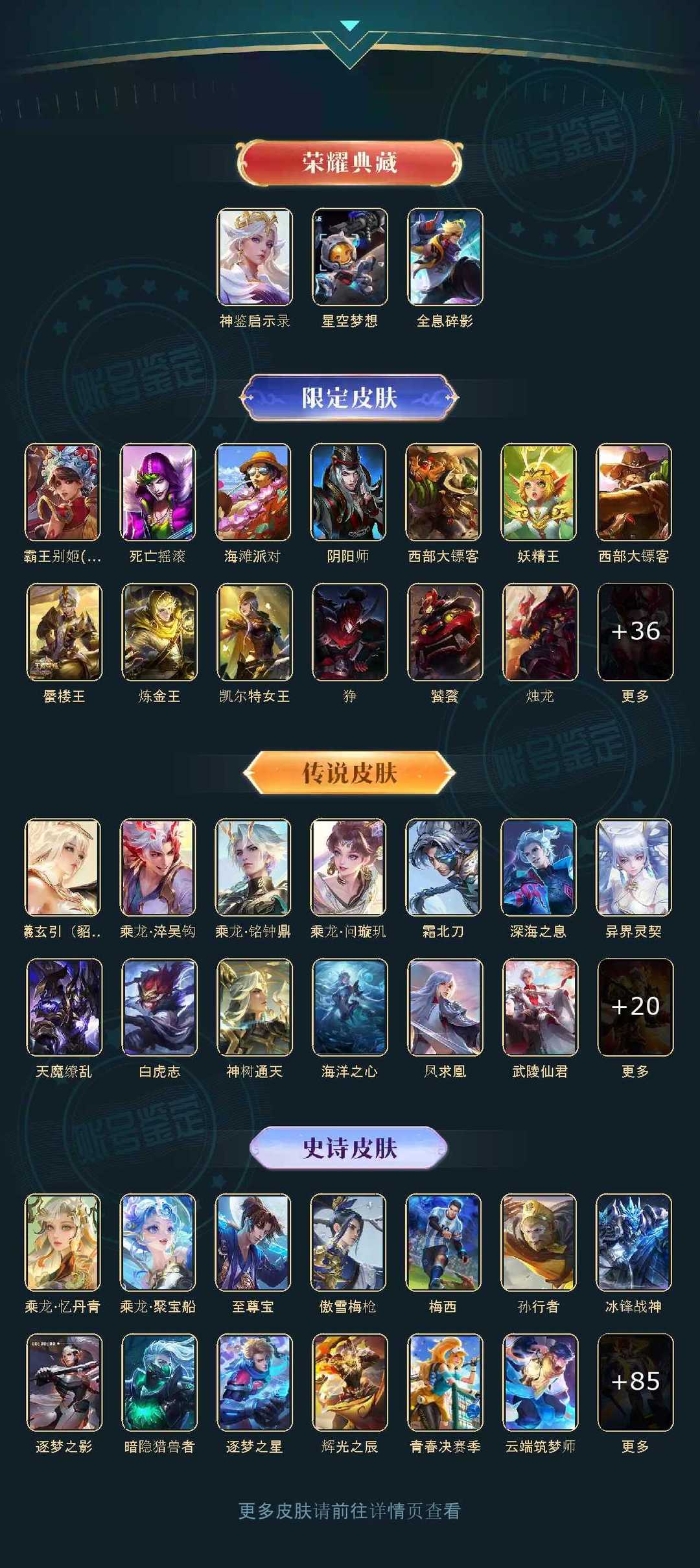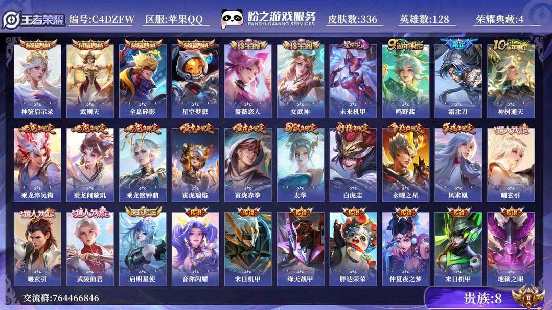 限制: 租号1次及以上 |装备描述:贵族9 荣耀典藏4 星传说1 传说皮肤33 星元套装15 史诗皮肤99 发育路21段 皮肤数量336 皮肤价值:300462 天幕1 英雄128 永恒钻石IV 总场次10102