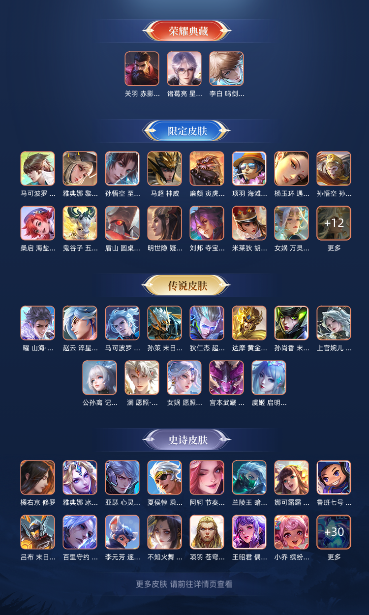 至尊宝,深海之息,末日机甲加星元,诸葛典藏,关羽典藏,李白典藏,多款热门传说皮肤和史诗皮肤+最强王者