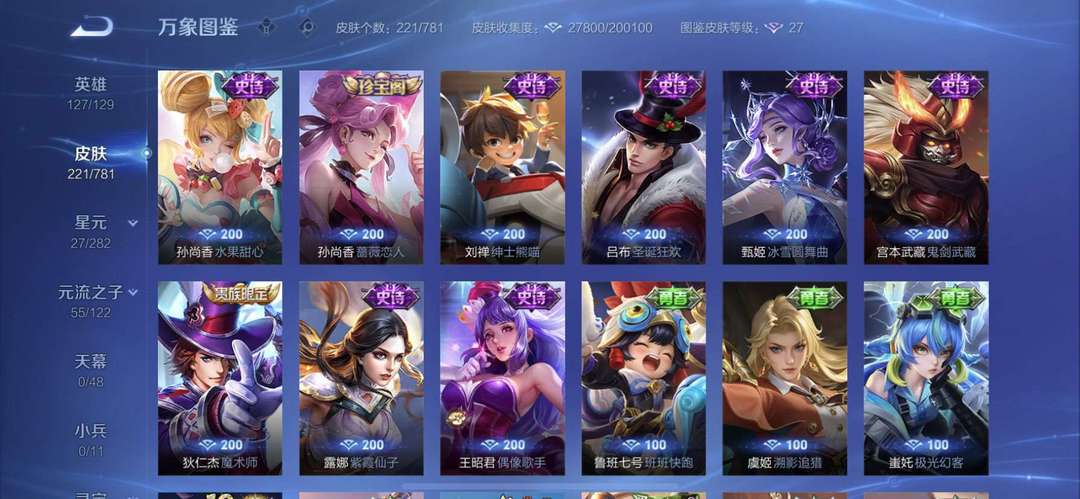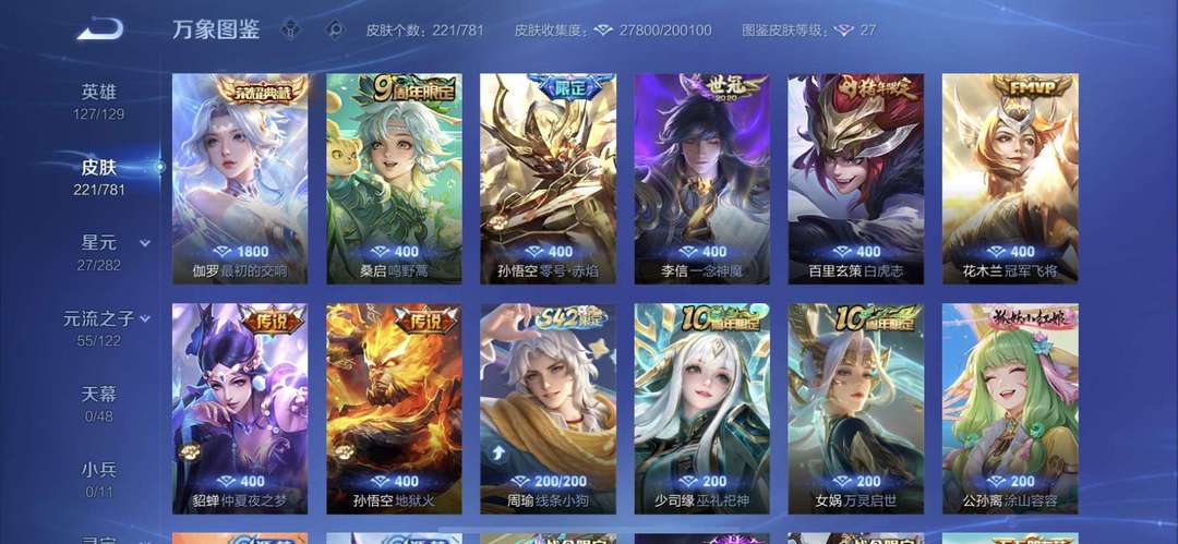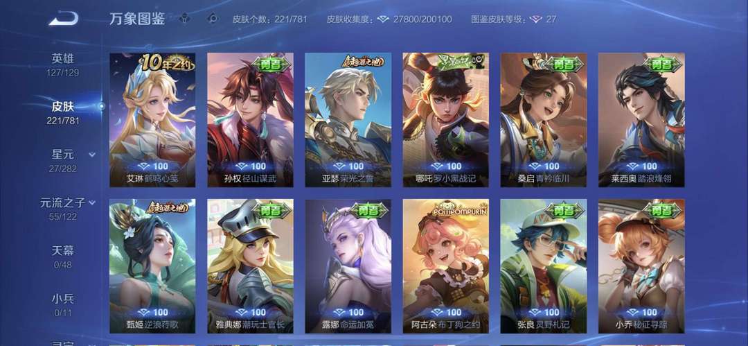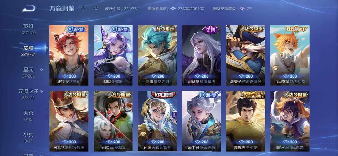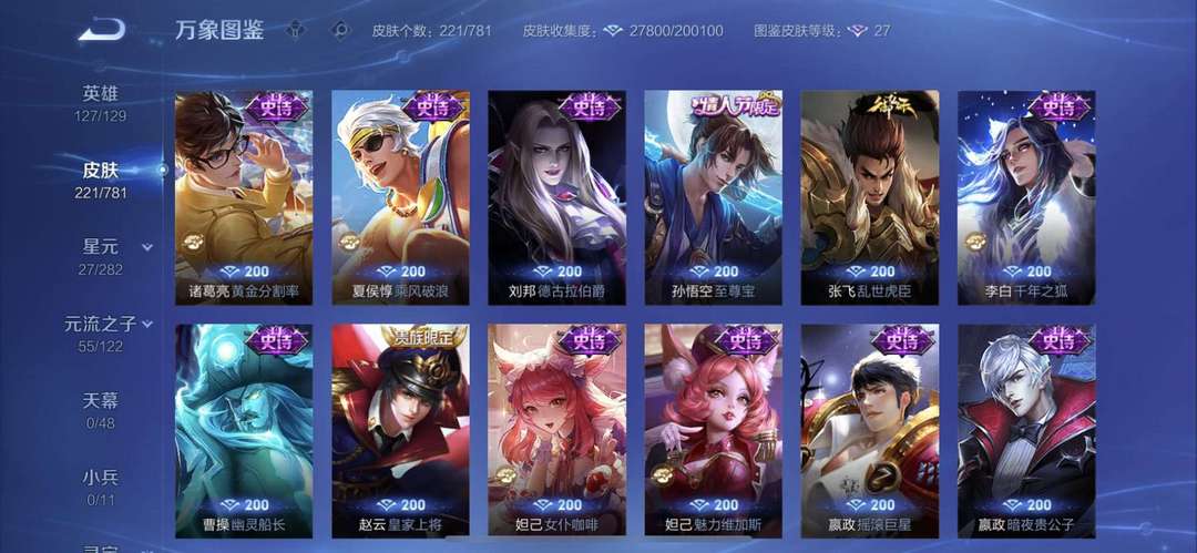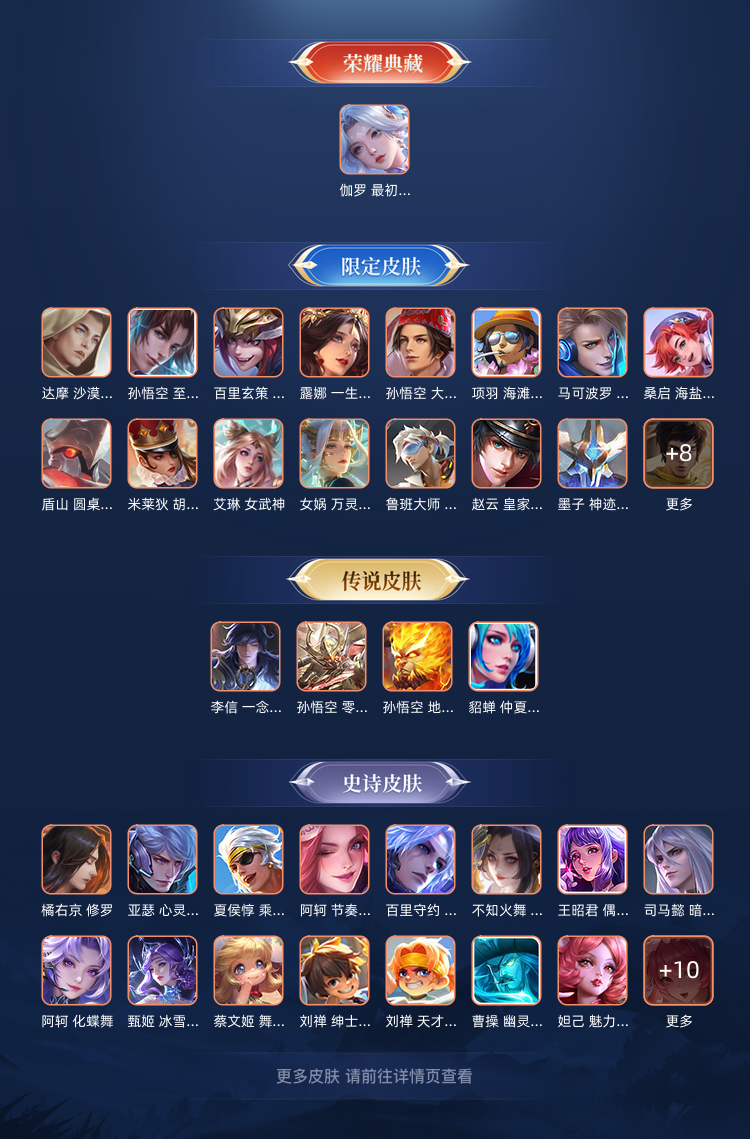 227皮肤,128英雄,最初的交响,仲夏夜之梦,地狱火,至尊宝,零号·赤焰,一念神魔,白虎志