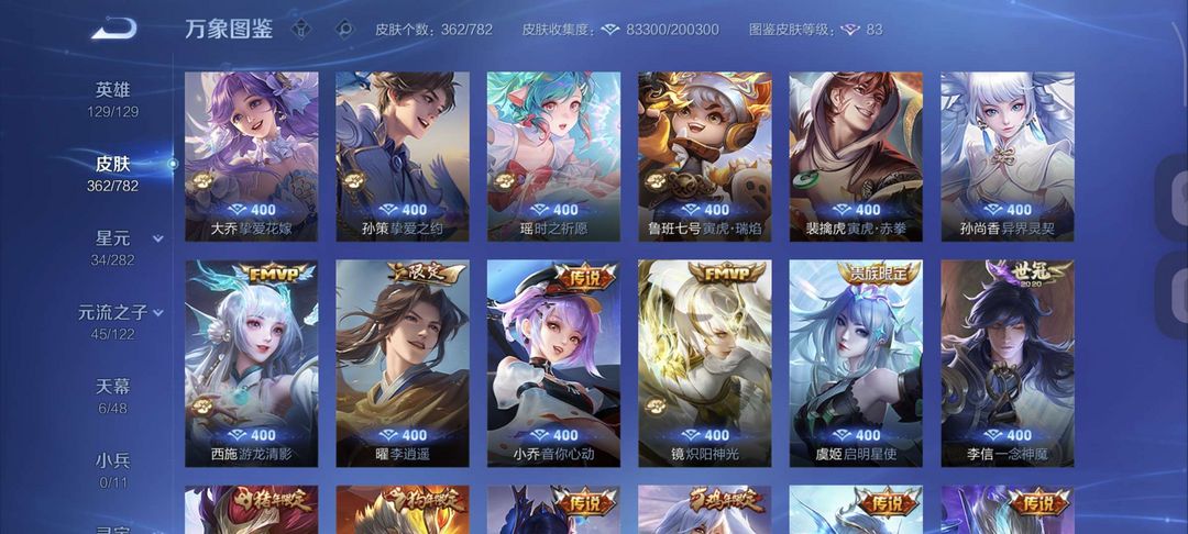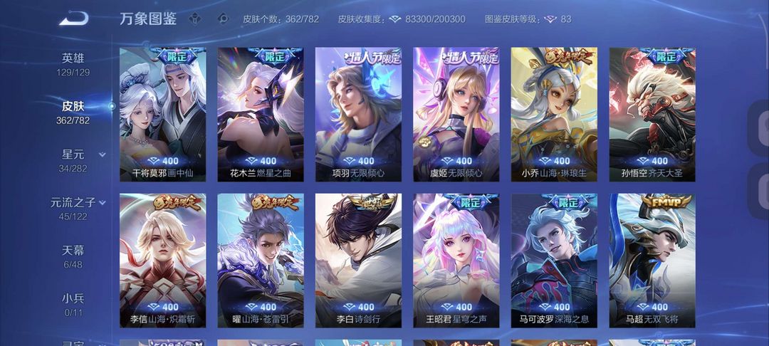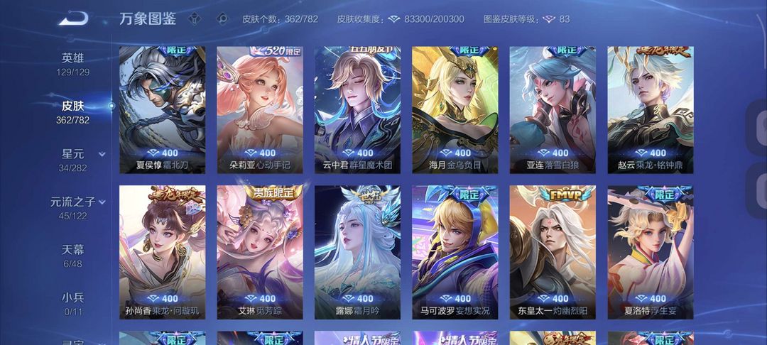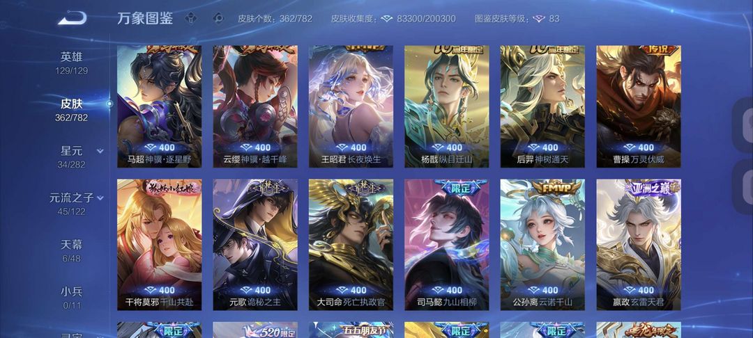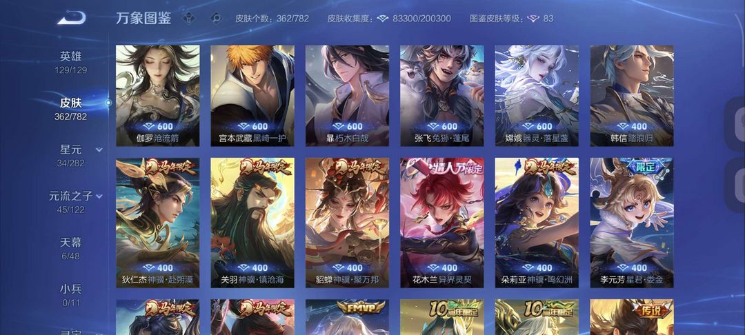 无双贵十 全英雄 362 个皮肤,两典藏,十无双,,五珍品,六十一传说