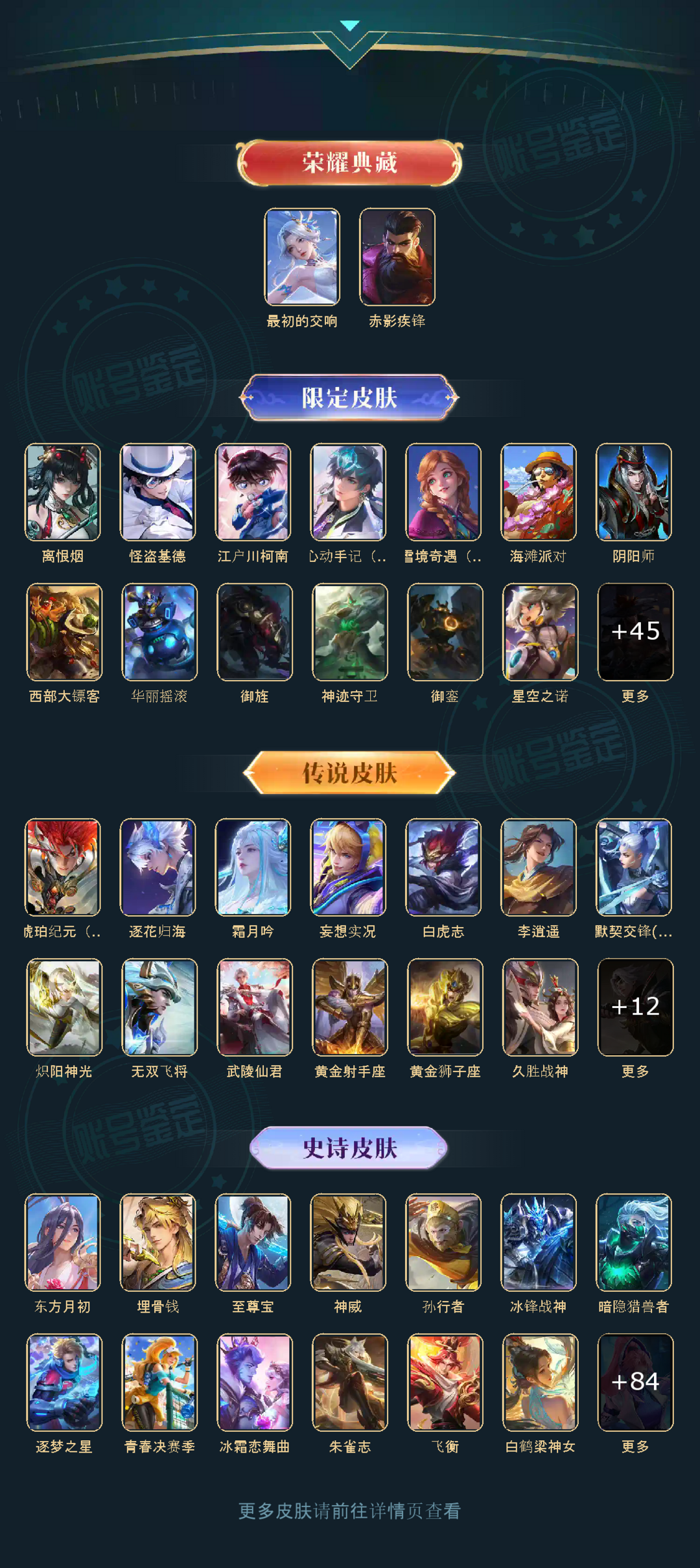 装备描述:英雄:公孙离(公孙离 记忆之芯,公孙离 离恨烟,公孙离 玉兔公主,公孙离 蜜橘之夏,公孙离 无限星赏官,公孙离 祈雪灵祝,公孙离 花间舞);马可波罗(马可波罗 怪盗基德,马可波罗 妄想实况,马可波罗 星界特工,马可波罗 逐梦之星,马可波罗 暗影游猎,马可波罗 激情绿茵);关羽(关羽 赤影疾锋,关羽 冰锋战神,关羽 武圣,关羽 龙腾万里);马超(马超 琥珀纪元,马超 访茗客,马超 无双飞将,马超 神威);百里玄策(百里玄策 原初追逐者,百里玄策 白虎志,百里玄策 威尼斯狂欢);艾琳(艾琳 鹤鸣心笺,艾琳 陌上桑,艾琳 女武神);干将莫邪(干将莫邪 雾都夜雨,干将莫邪 冰霜恋舞曲,干将莫邪 久胜战神);敖隐;镜(镜 青焰无极,镜 炽阳神光,镜 冰刃幻境);虞姬(虞姬 夏日便利店,虞姬 启明星使);孙尚香(孙尚香 水果甜心,孙尚香 末日机甲,孙尚香 沉稳之力);大司命(大司命 东方月初,大司命 暗都幽影);伽罗(伽罗 最初的交响,伽罗 天狼溯光者);澜(澜 逐花归海,澜 孤猎);曜(曜 李逍遥 ,曜 云鹰飞将,曜 归虚梦演);孙悟空(孙悟空 神迹守卫,孙悟空 至尊宝,孙悟空 孙行者,孙悟空
