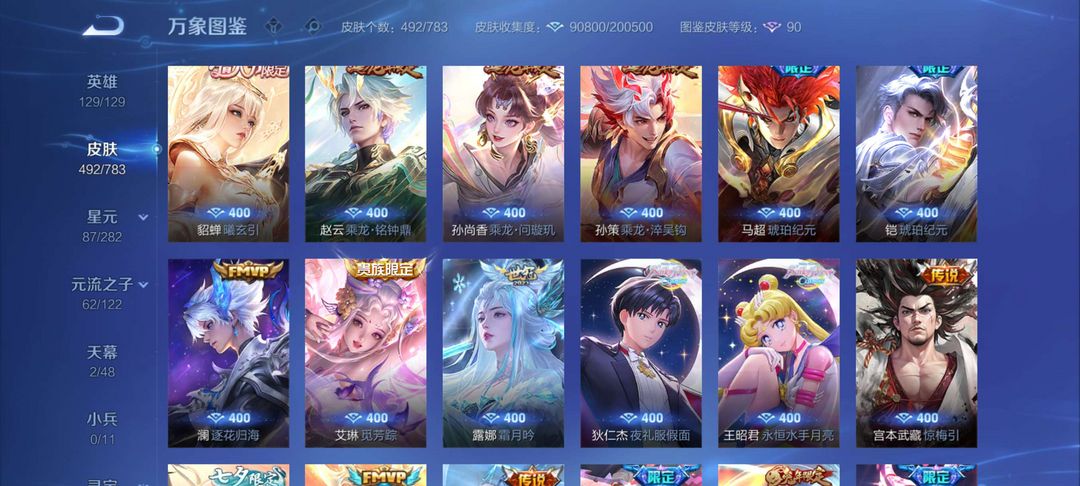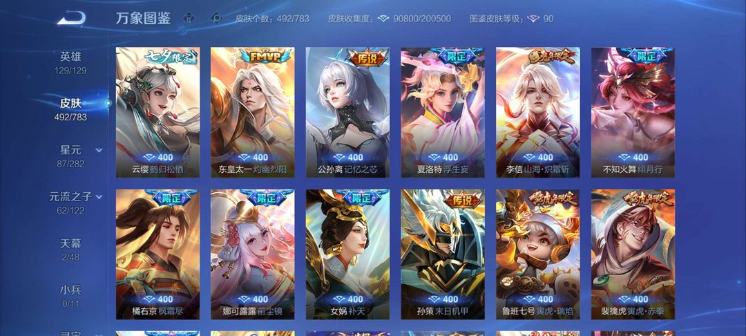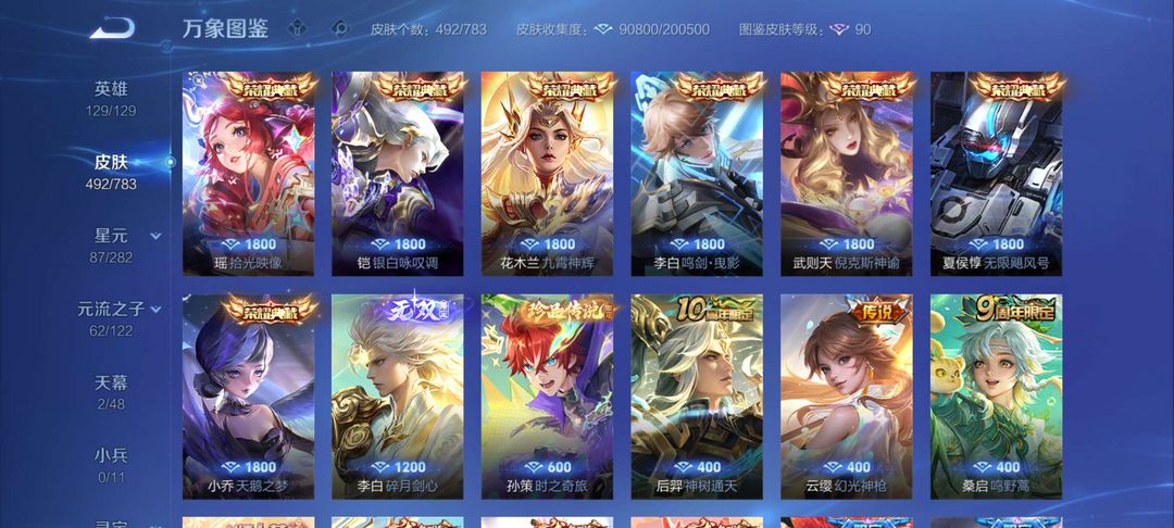 装备描述:- 贵族等级:V10(累计充值≥18888元) - 皮肤数量:492 - 全英雄:129/129,荣耀典藏:瑶-拾光映像、铠-银白咏叹调、花木兰-九霄神辉、李白-鸣剑·曳影、武则天-倪克斯神谕、夏侯惇-无限飓风号、小乔-天鹅之梦- 无双限定:李白-碎月剑心,孙策-时之奇旅,寅虎全系列、乘龙全系列、兔年限定,圣斗士星矢、BLEACH、狐妖小红娘、美少女战士、DC神奇女侠等武则天-海洋之心、吕布-天魔