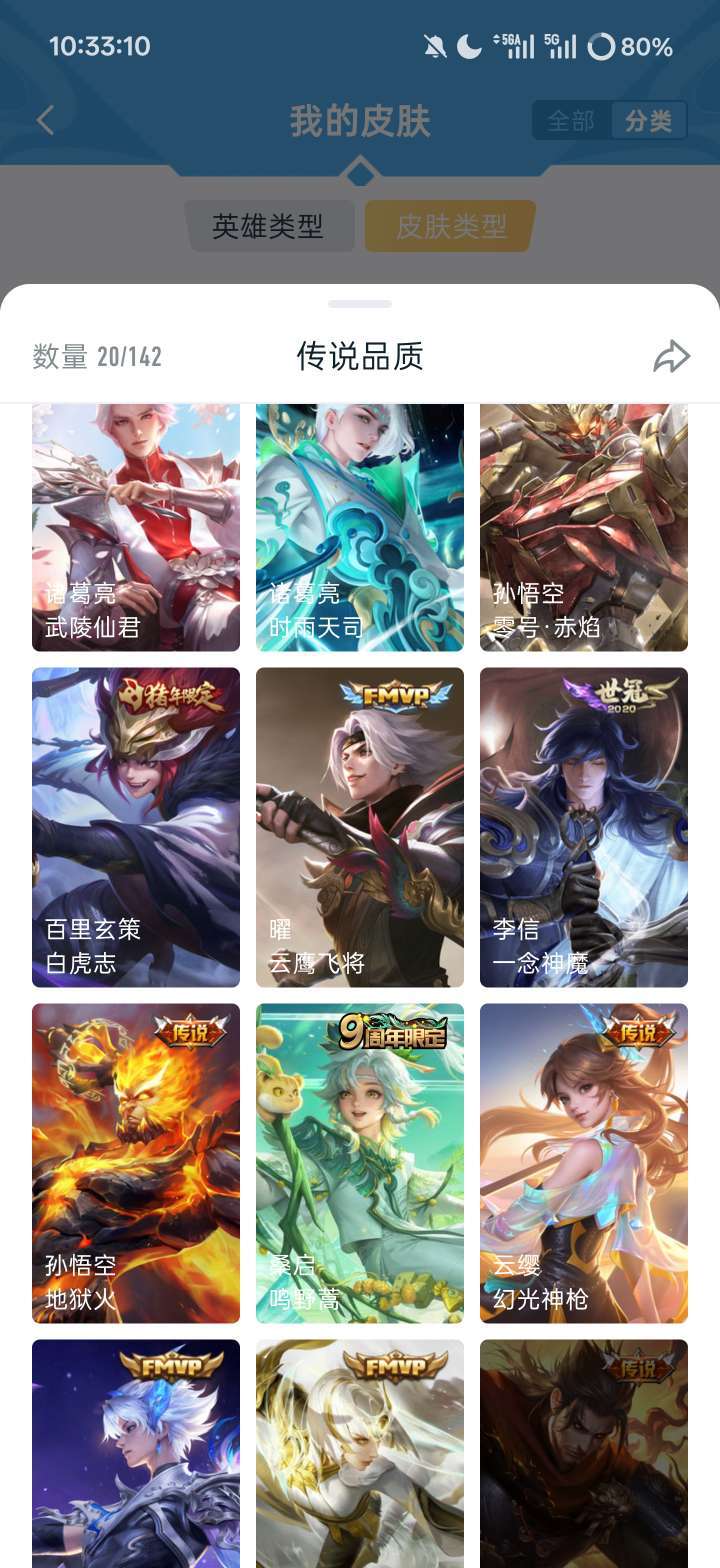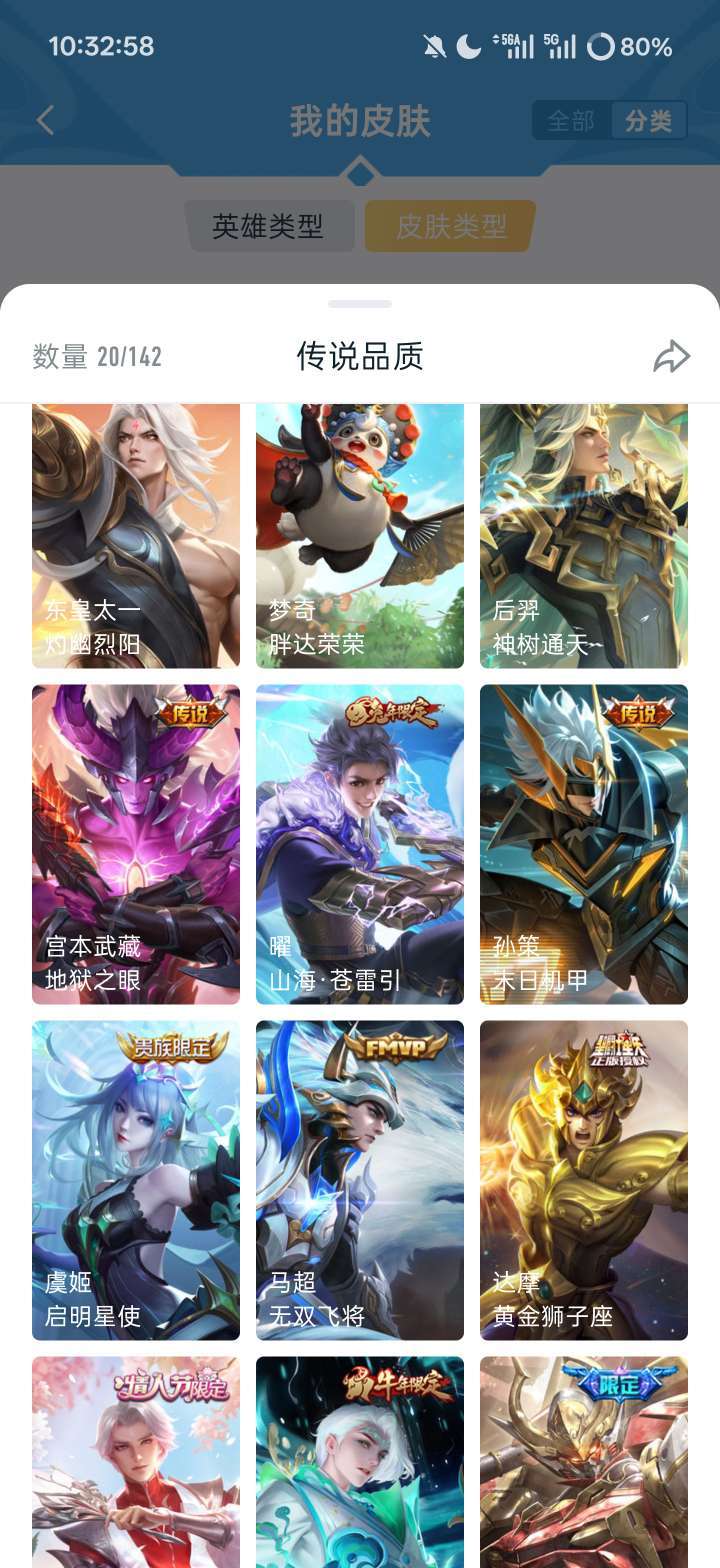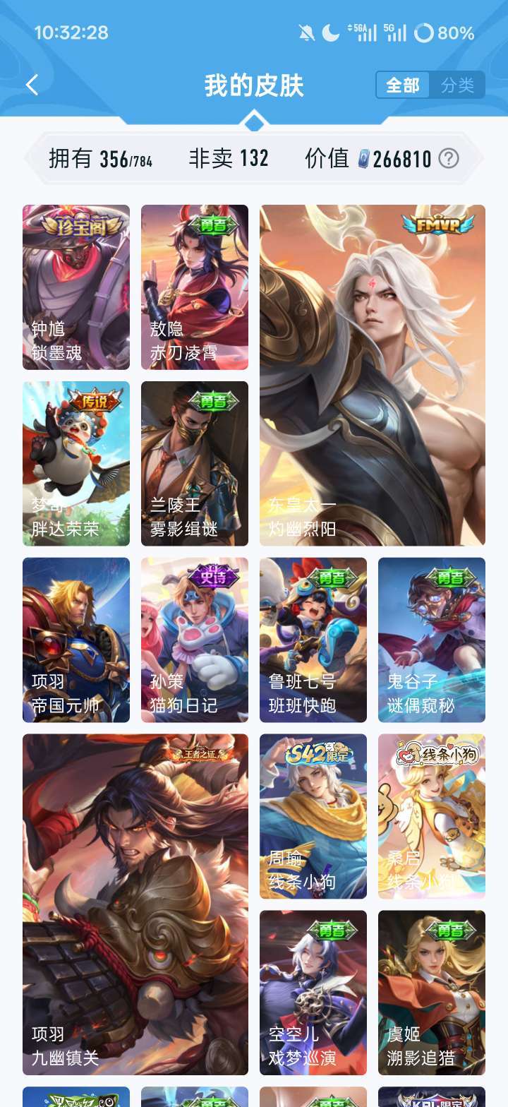 V8,356皮肤,1典藏/瑶的大耳狗/无双飞将/至尊宝/白虎志/地狱火/幽冥之眼等