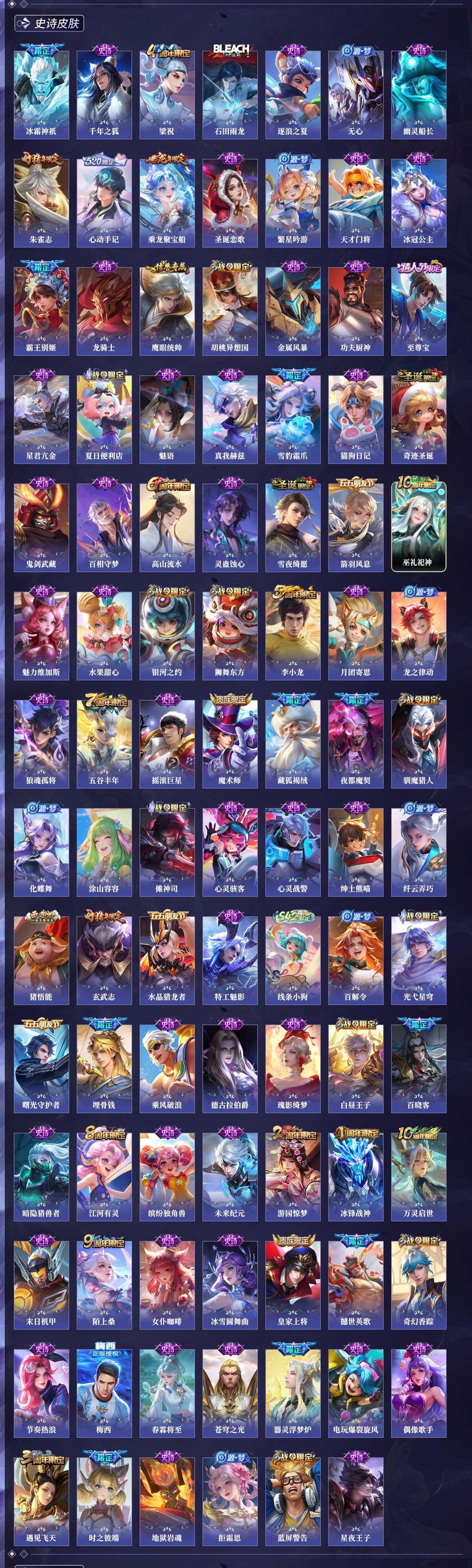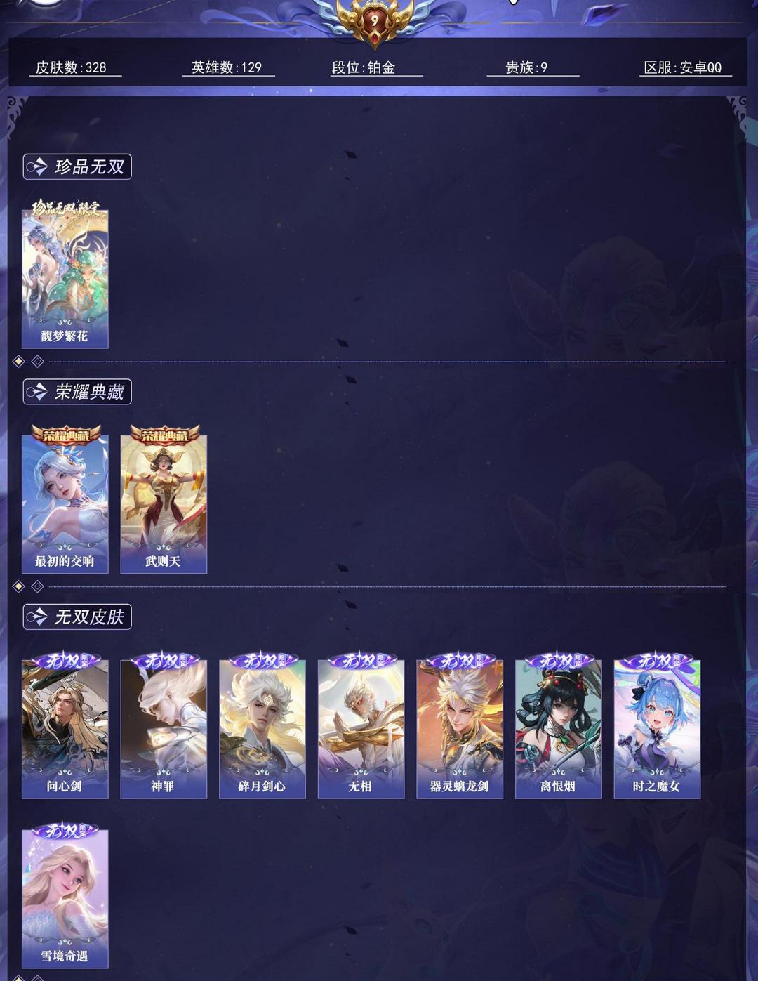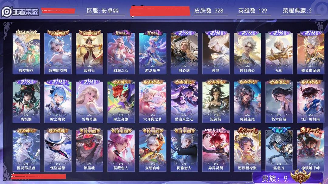 装备描述:【英雄数量】129【皮肤数量】328【贵族等级】贵族9【荣耀典藏】 2 伽罗_最初的交响、武则天 【珍品无双】 1 貂蝉_馥梦繁花 【无双皮肤】 8 孙悟空_无相、李白_碎月剑心、甄姬_雪境奇遇、李信_问心剑、铠_神罪、曜_器灵螭龙剑、小乔_时之魔女、公孙离_离恨烟 【珍品传说】 9 张飞_兔狲蓬尾、伽罗_沧流箭、暃_朽木白哉、嫦娥_器灵落星盏、瑶_大耳狗之梦、安琪拉_酷洛米之心、鲁班七号_江户川柯南、孙策_时之奇旅、马可波罗_怪盗基德 【星元皮肤】 2 幻海之心、游龙堇华 【传说皮肤】 44 韩信_踏浪归、貂蝉_神骥聚万邦、夏侯惇_霜北刀、澜_愿照九州拓、嬴政_玄雷天君、李信_一念神魔、王昭君_长夜焕生、花木兰_异界灵契、司空震_愿照山河定、王昭君_映山客、武则天_海洋之心、虞姬_愿照岁时盈、赵云_乘龙铭钟鼎、桑启_鸣野蒿、虞姬_启明星使、朵莉亚_神骥鸣幻洲、云缨_神骥越千峰、露娜_霜月吟、花木兰_冠军飞将、镜_炽阳神光、女娲_愿照千秋盛、妲己_愿照众生和、后羿_神树通天、西施_续相思、后羿_千劫归真、孙尚香_乘龙问璇玑、百里玄策_白虎志、关羽_神骥镇沧海....