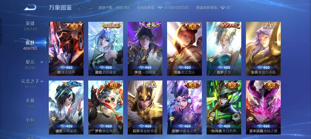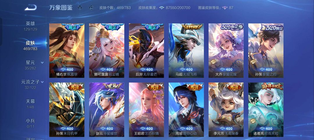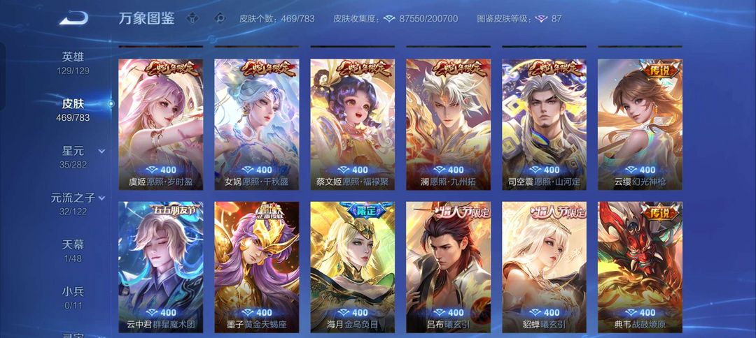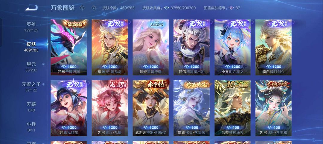 V10账号有469皮,含吕布天魔渊典藏、曜灵螭龙剑等8款无双,还有雪境奇遇/太华/齐天大圣限定
