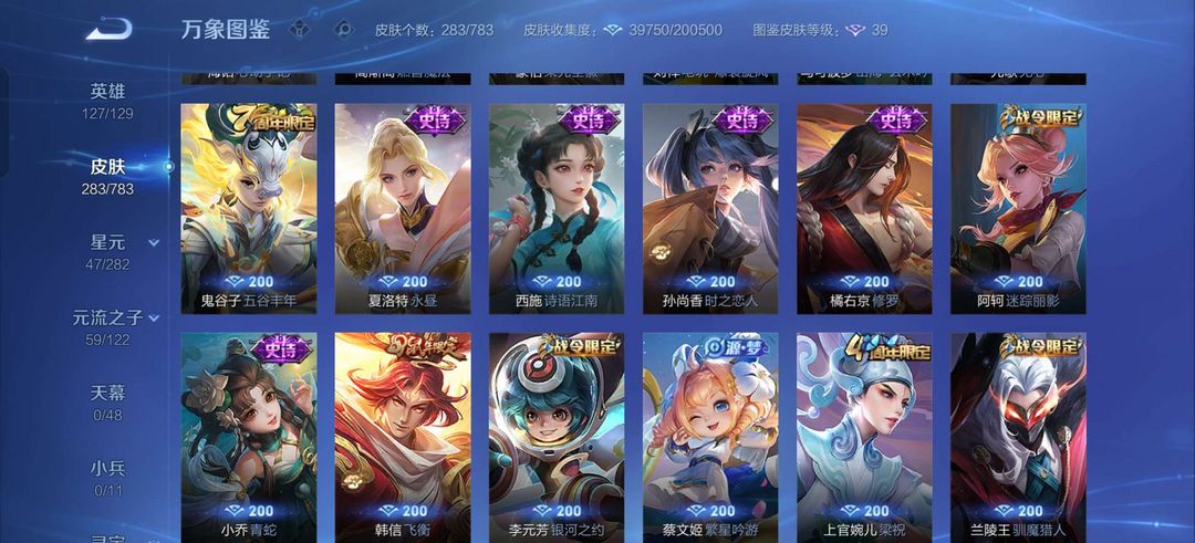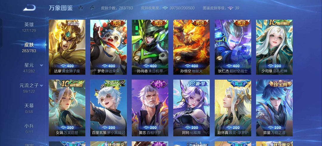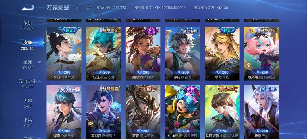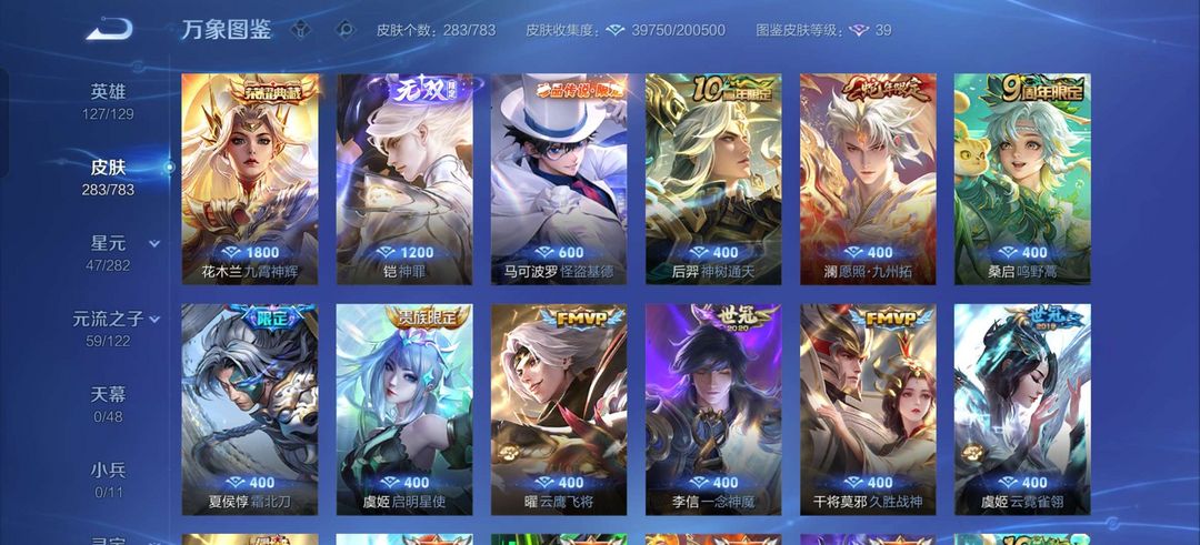 花木兰典藏,凯无双,马可波罗怪盗基德,夏侯惇霜北刃,等大量传说皮肤。