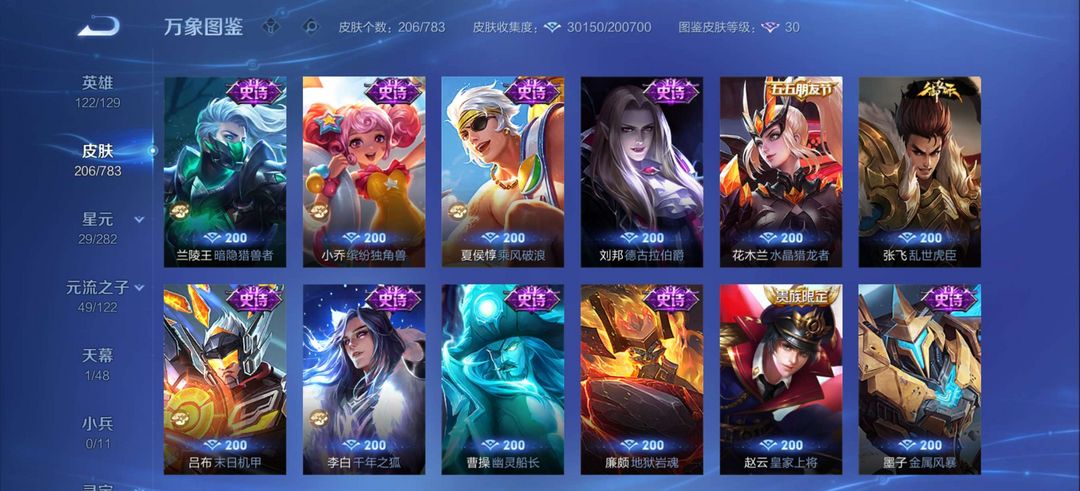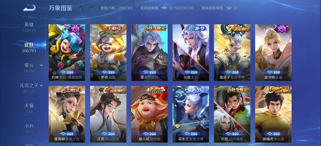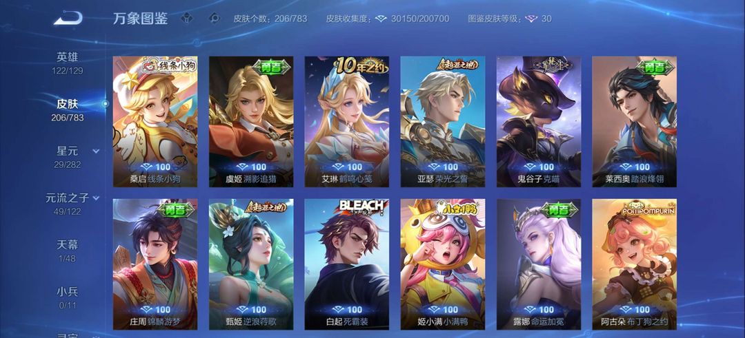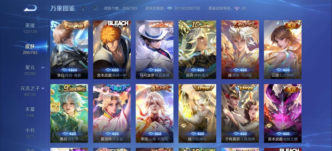 荣耀王者 V7 1典藏 204皮 愿照·九州拓/鸣剑·曳影/怪盗基德/神威/黑崎一护