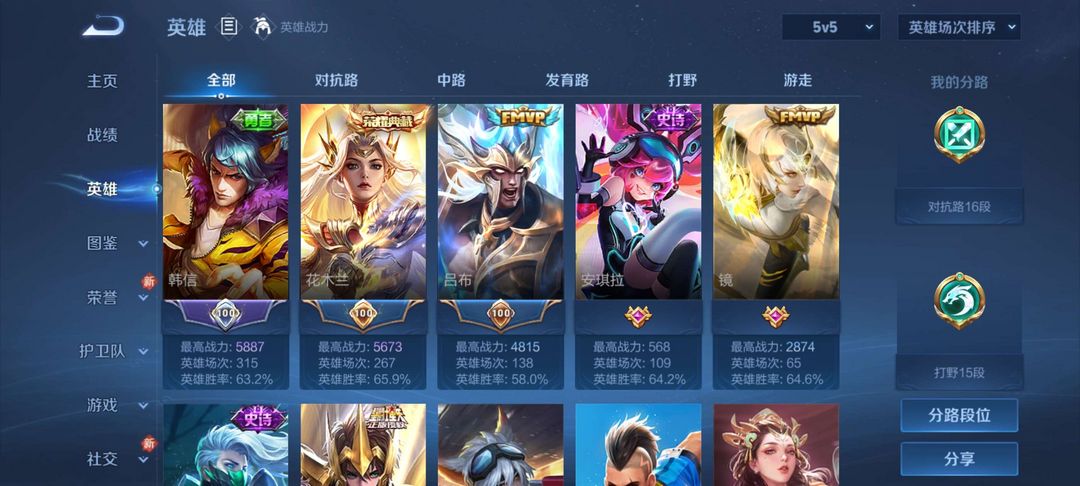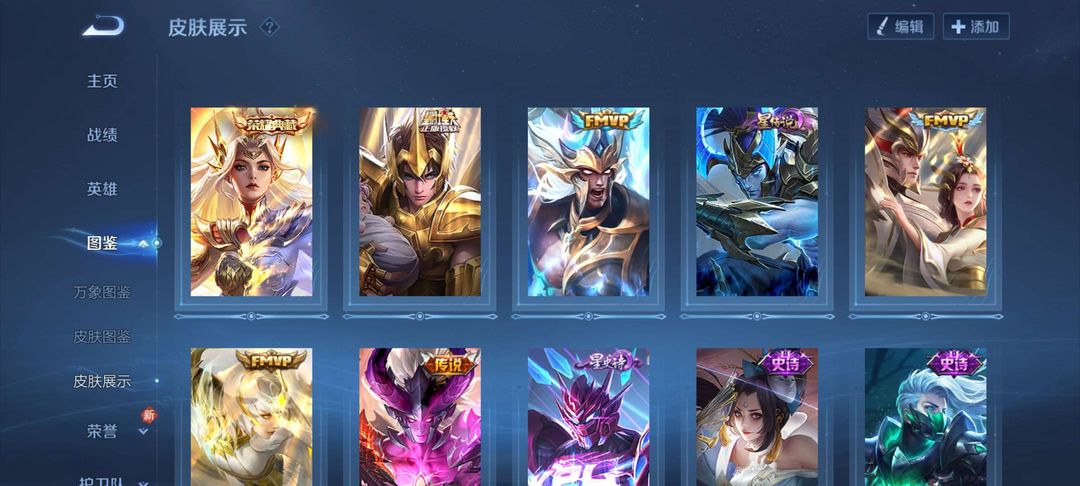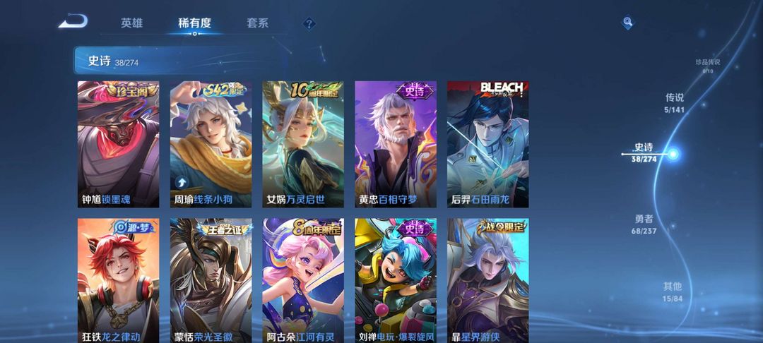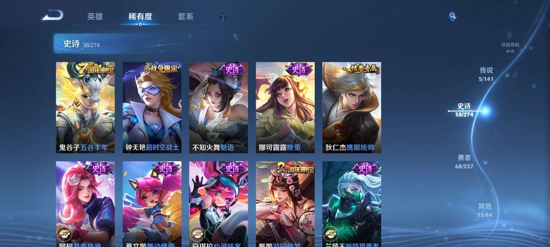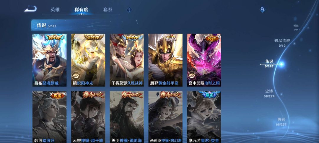 花木兰荣耀典藏还有很多传说皮肤,宫本武藏星传说还有干将久胜战神很多史诗皮肤目前王者段位铭文全满