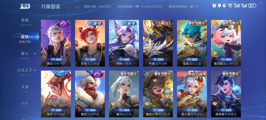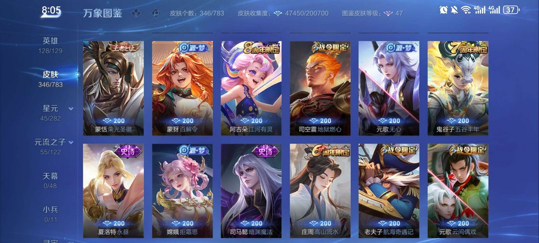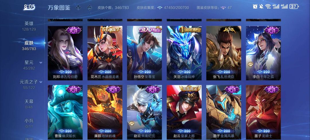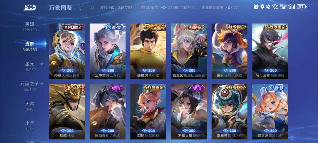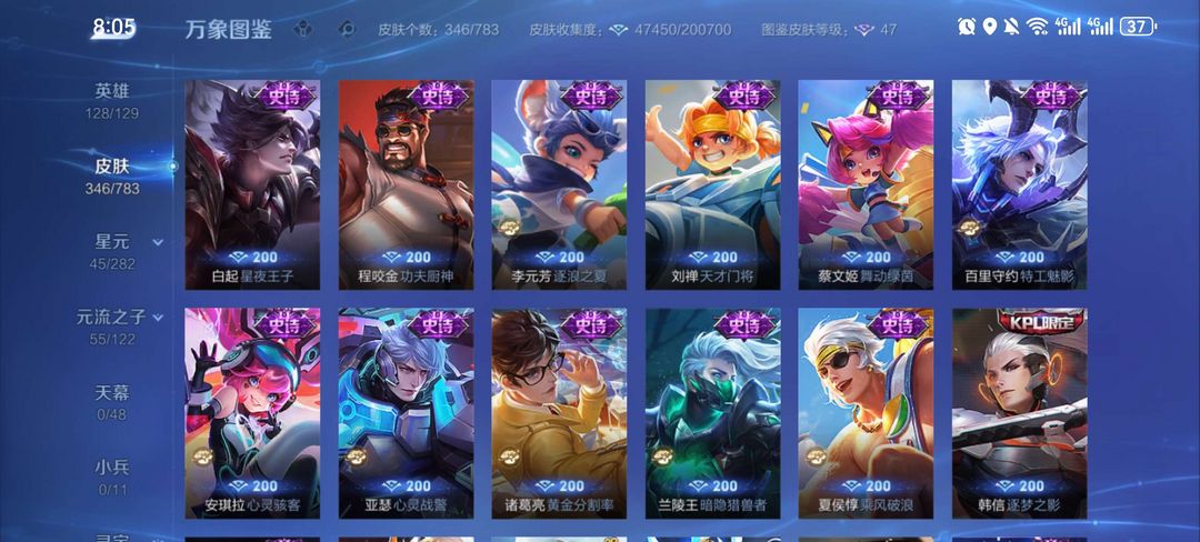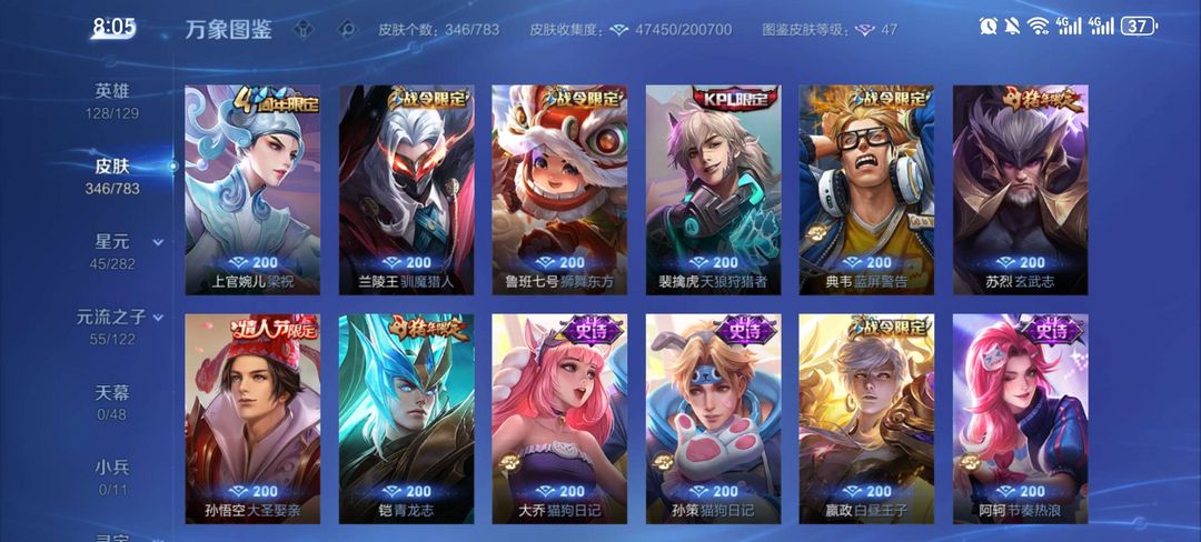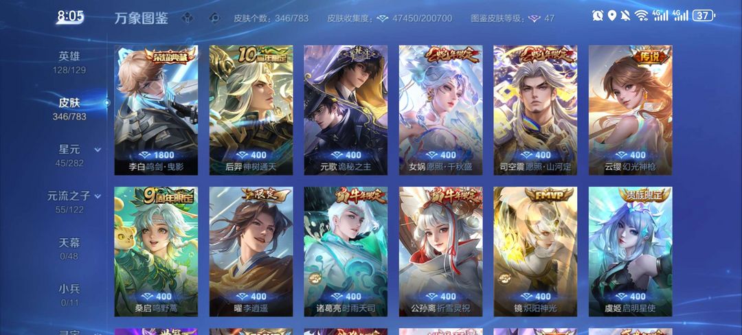全英雄(除武则天)全铭文鸣剑曳影白虎志凤求凰至尊宝诡秘之主等许多皮肤