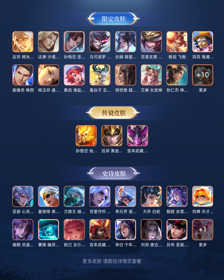 梅西 白虎志 踏浪归 后羿狗年限定黄金射手 至尊宝 狄仁杰马限 宫本幽冥之眼 猴子幽冥火 等.