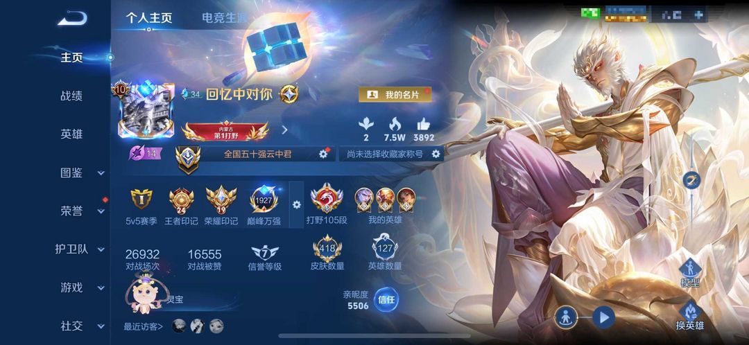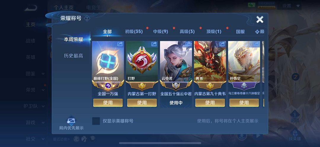 (禁玩巅峰赛)本周云中君小国标在榜+巅峰万强闪电框,孙悟空无双限定,105段国服打野,历史3大国标