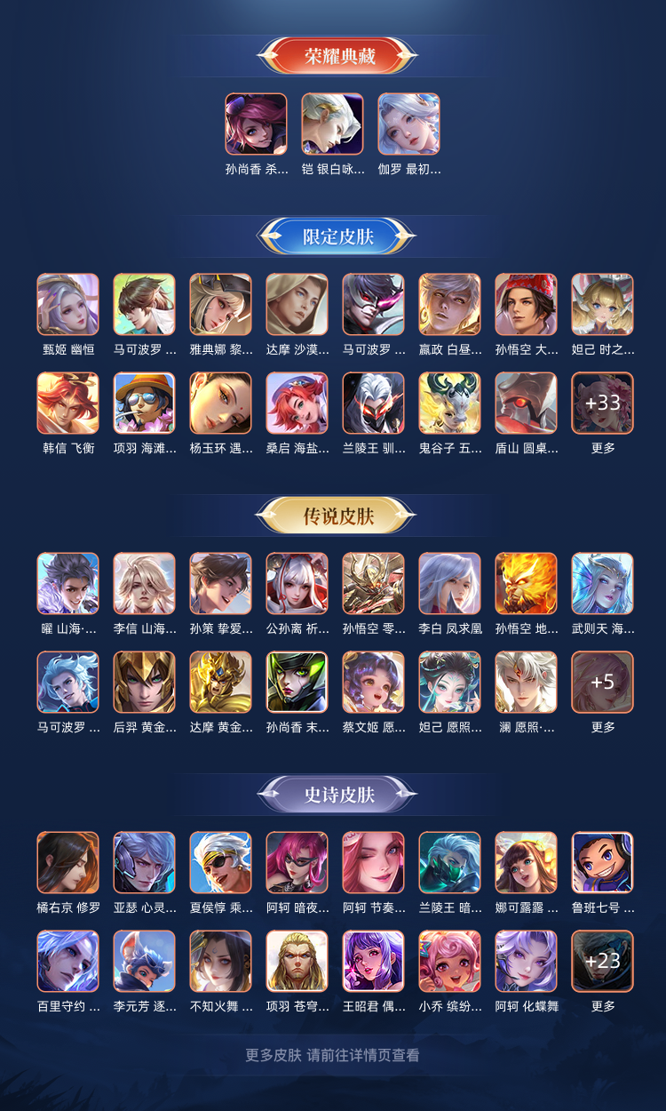 装备描述:英雄:艾琳(艾琳 女武神,艾琳 鹤鸣心笺,市标);孙尚香(孙尚香 末日机甲,孙尚香 沉稳之力,孙尚香 杀手不太冷,孙尚香 水果甜心);鲁班七号(鲁班七号 班班快跑,鲁班七号 蔬乡物语,鲁班七号 电玩小子,鲁班七号 黑桃队长,鲁班七号 狮舞东方,鲁班七号 福禄兄弟,区标);马可波罗(马可波罗 暗影游猎,马可波罗 山海·玄木吟,马可波罗 深海之息,马可波罗 潮玩牛仔,马可波罗 激情绿茵);公孙离(公孙离 涂山容容,公孙离 祈雪灵祝,公孙离 无限星赏官,公孙离 花间舞);镜(镜 炽阳神光,镜 冰刃幻境);孙悟空(孙悟空 齐天大圣,孙悟空 零号·赤焰,孙悟空 大圣娶亲,孙悟空 地狱火,孙悟空 西部大镖客);狄仁杰(狄仁杰 神骥·赴朔漠,狄仁杰 万华元夜,狄仁杰 鹰眼统帅,狄仁杰 魔术师,狄仁杰 阴阳师);虞姬(虞姬 溯影追猎,虞姬 愿照·岁时盈,虞姬 启明星使,虞姬 加勒比小姐);澜(澜 愿照·九州拓,澜 孤猎);伽罗(伽罗 最初的交响,伽罗 天狼溯光者,伽罗 花见巫女);大司命(大司命 暗都幽影);宫本武藏(宫本武藏 地狱之眼,宫本武藏 鬼剑武藏,宫本武藏 未来纪元,宫本武藏 万象初新);