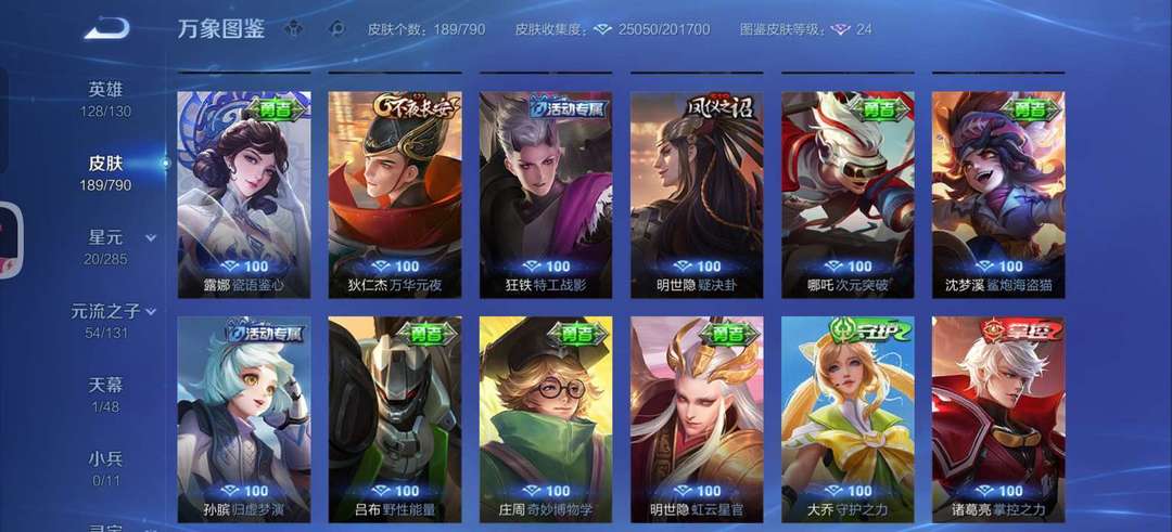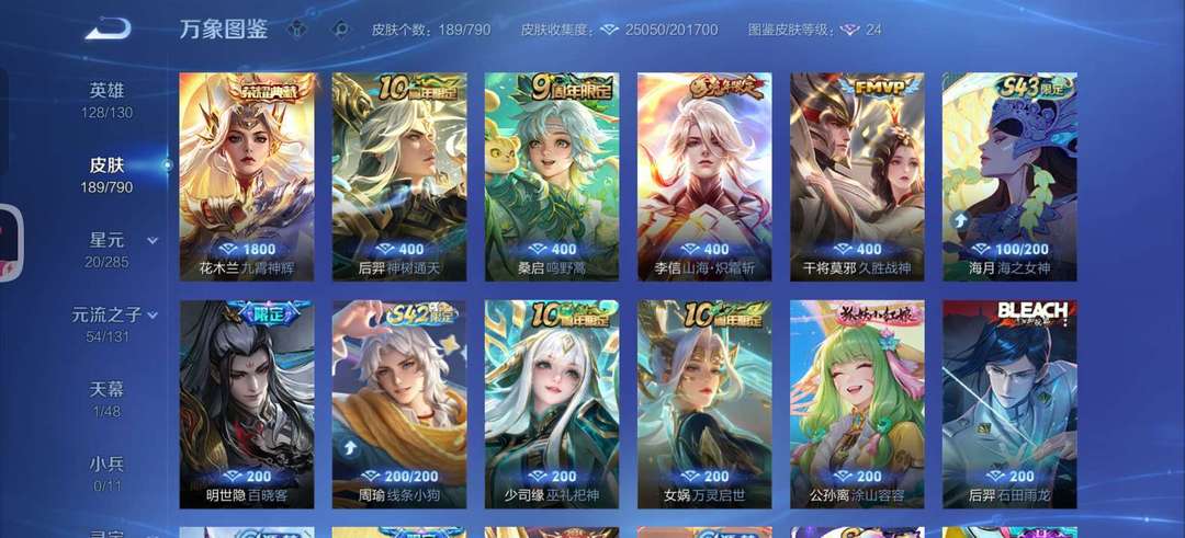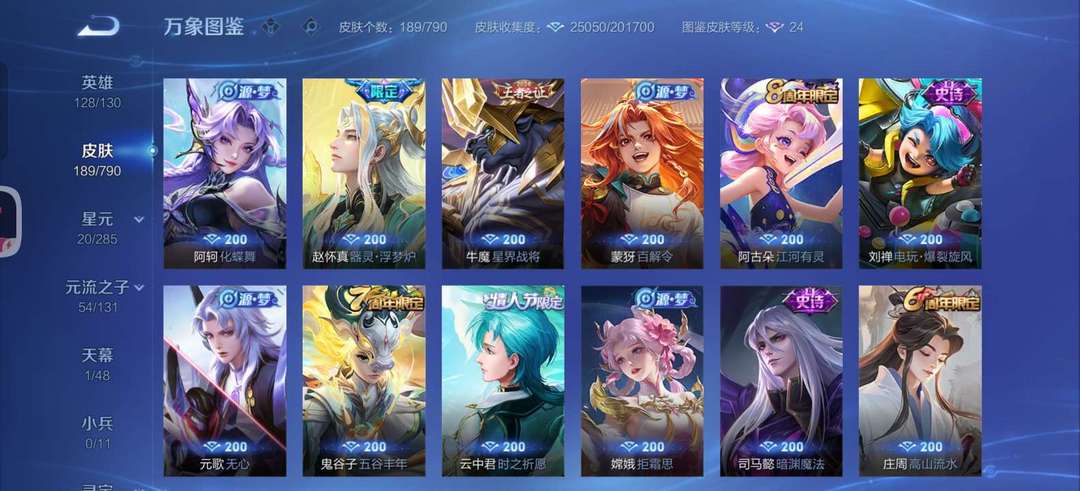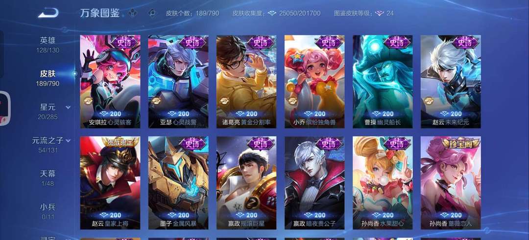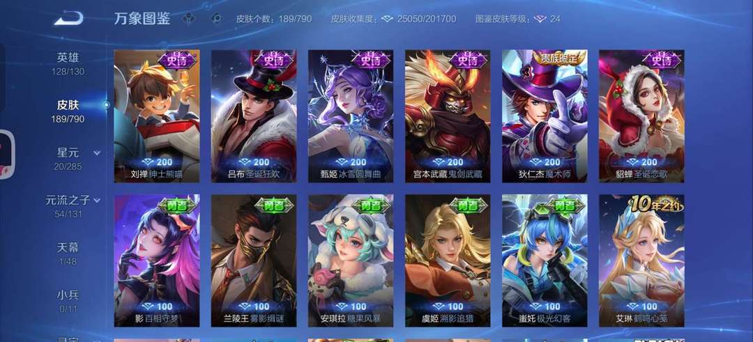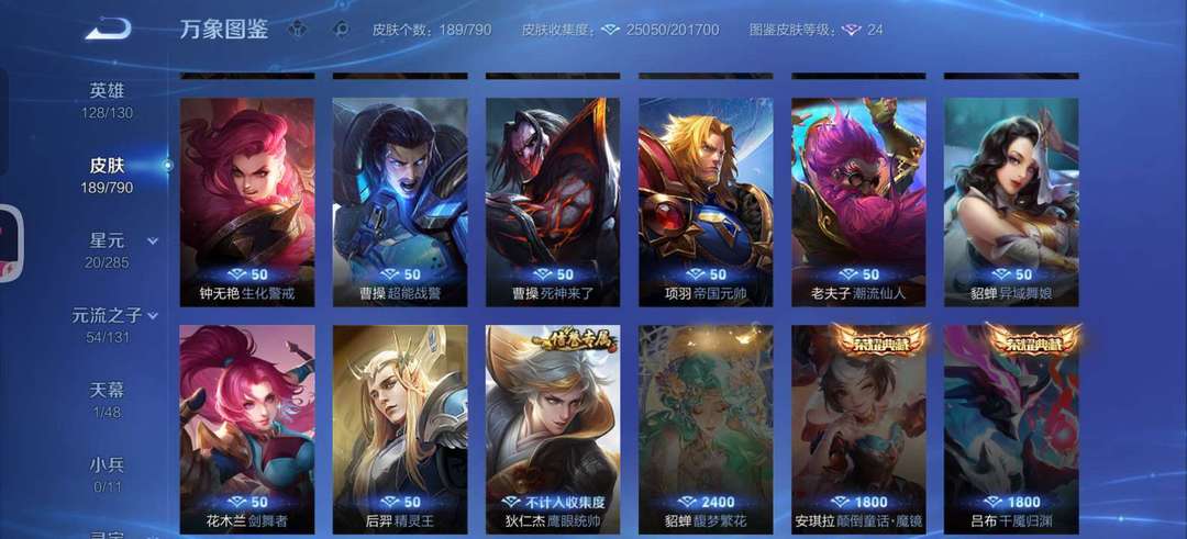英雄无武则天和敖隐,皮肤一个花木兰的典藏,四个传说,50个史诗,60个限定,其他皮肤若干