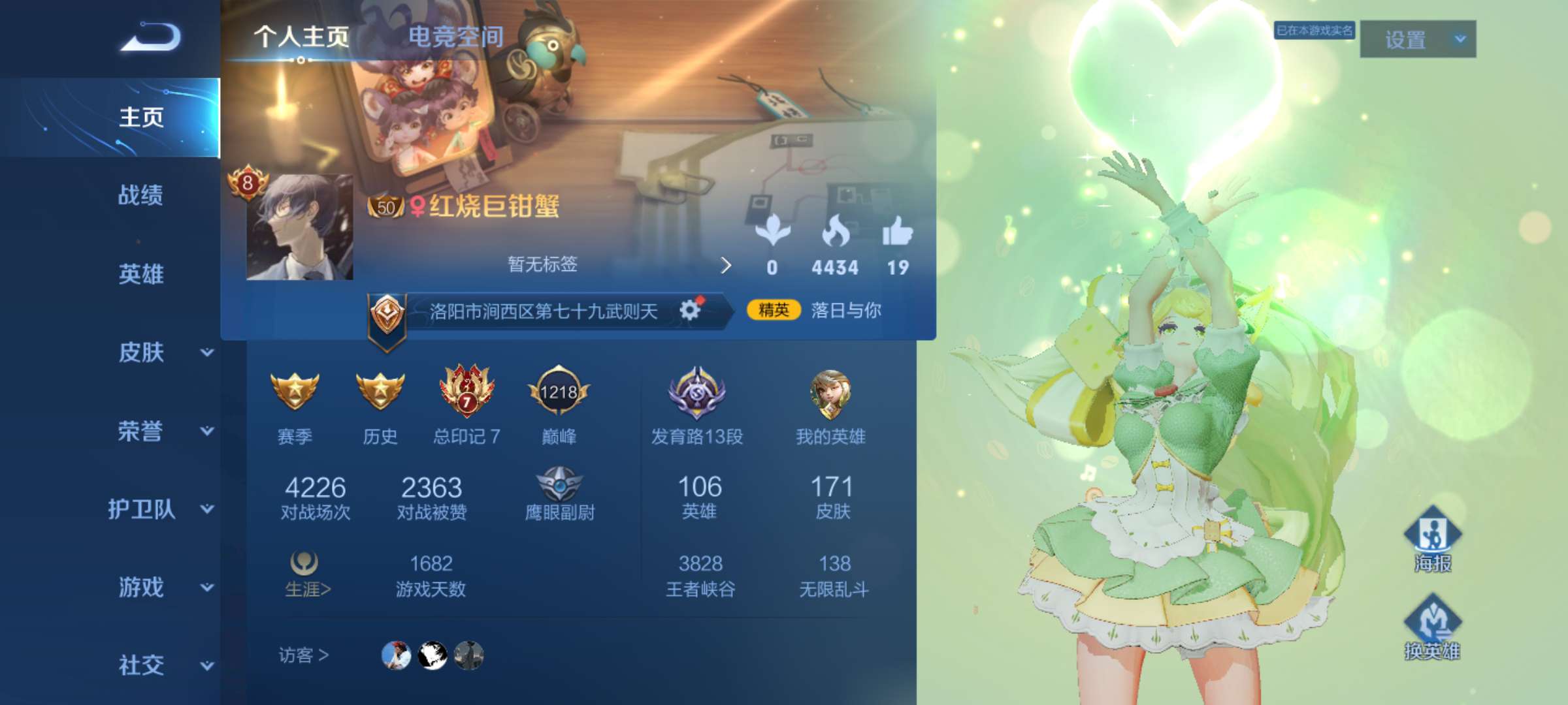 装备描述:贵族8武则天海洋之心,无限飓风号,超多传说限定,五虎上将,超多皮肤,多五级铭文,妹子号,看图喜欢的就租。