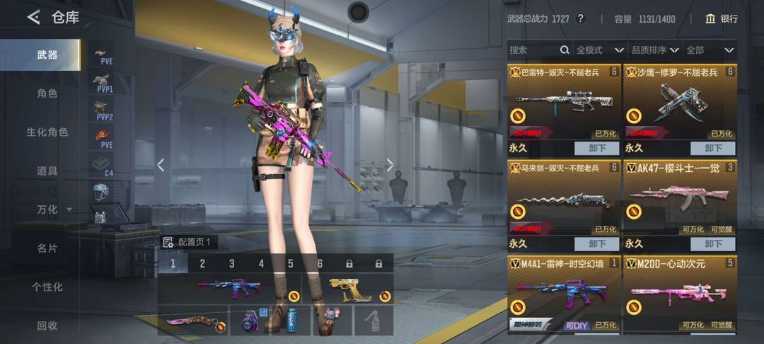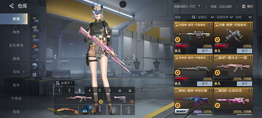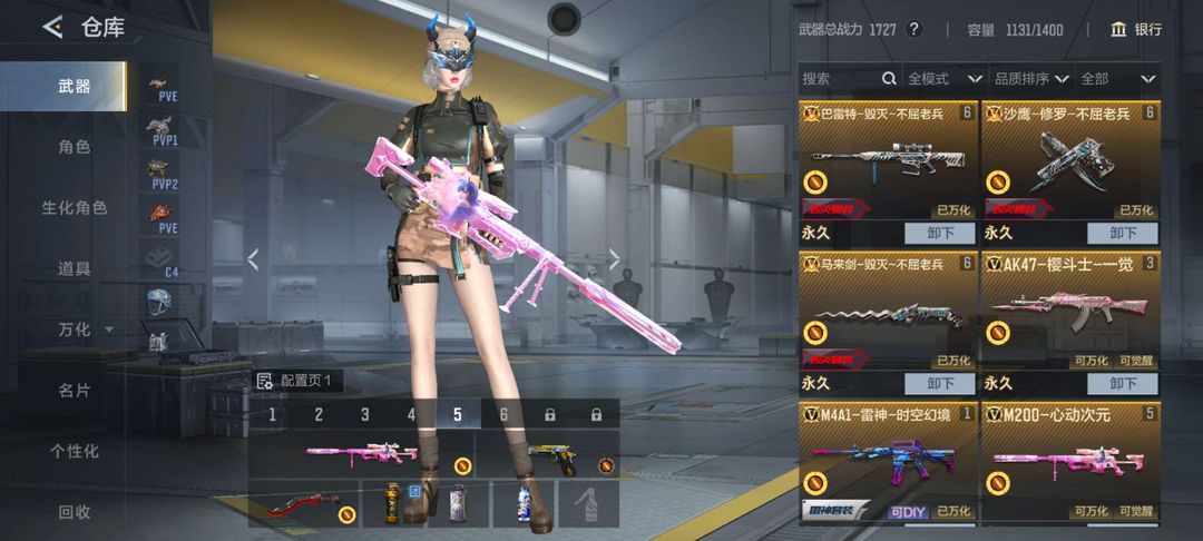装备描述:巴雷特毁灭❤️雷神❤️沙鹰❤️心动次元❤️马来剑❤️樱斗士