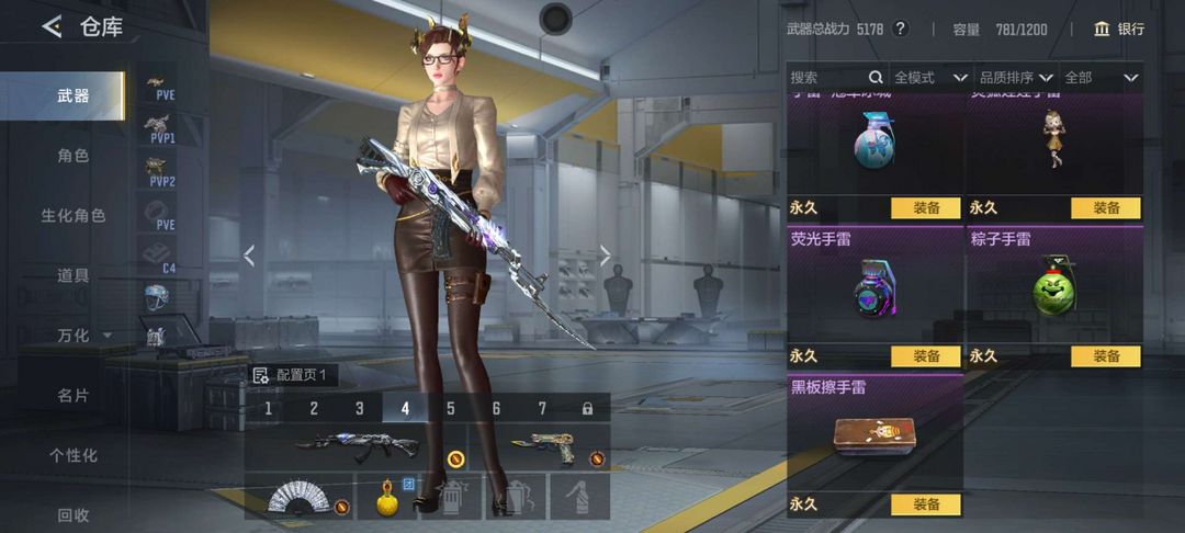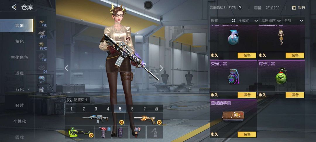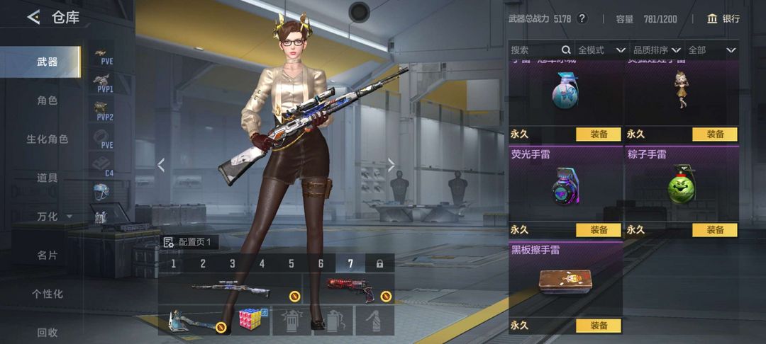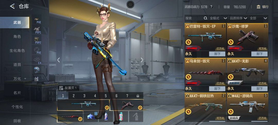 装备描述:巴雷特毁灭❤️雷神❤️沙鹰❤️心动次元❤️马来剑❤️樱斗士