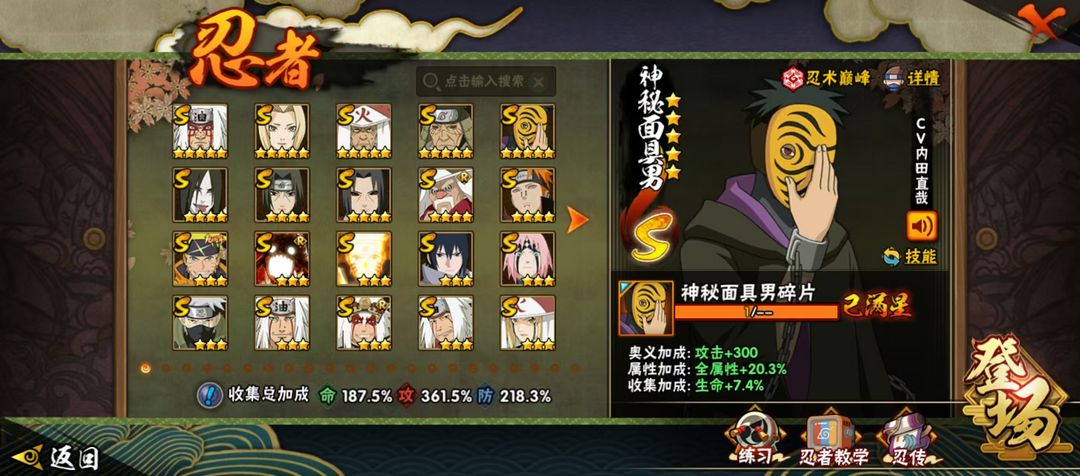 装备描述:53S忍 ✨秽土水门✨白面具✨三代猿飞日斩✨秽土鼬✨秽土斑✨自来也✨大蛇丸✨秽土长门✨仙人自来也仙自✨仙人兜✨四代雷影艾✨无✨二代千手扉间✨三代雷影艾✨秽土半藏✨天道佩恩✨百豪纲手✨千手柱间初代✨佩恩超天道超✨面具男✨水门✨金角银角✨须佐鼬✨纲手✨秽土二代✨鬼灯幻月✨斑✨豪杰自来也✨秽土三代✨大野木