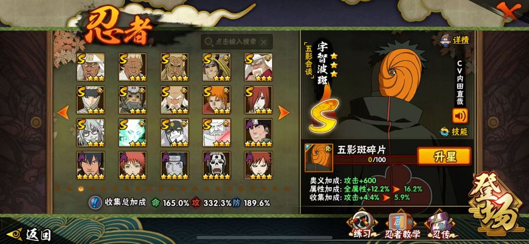 装备描述:S忍者:半藏 「秽土转生」;千手扉间;自来也 「舞之豪杰」;波风水门;宇智波鼬 「秽土转生」;宇智波鼬 「须佐能乎」;大蛇丸;猿飞日斩 「秽土转生」;宇智波带土 「忍界大战」;艾 「三代目雷影」;金角银角 「秽土转生」;纲手 「百豪」;宇智波斑;鬼灯幻月 「二代目水影」;药师兜 「仙人模式」;千手柱间;艾 「四代目雷影」;长门 「秽土转生」;佩恩 「天道」;无 「二代目土影」;宇智波斑 「秽土转生」;“宇智波斑” 「白面具」;自来也;罗砂 「四代目风影」;纲手;千手扉间 「秽土转生」;佩恩·天道 「超」;神秘面具男;波风水门 「秽土转生」;千手柱间 「秽土转生」;迈特凯 「死门」 A忍者:志村团藏;宇智波止水;我爱罗 「忍界大战」;角都;猿飞日斩 「火影继承人」;宇智波佐助 「须佐能乎」;春野樱 「百豪」;地陆;猿飞木叶丸 「木叶上忍」;角都 「晓创生」;迈特凯;旗木卡卡西 「万花筒写轮眼」;奇拉比;角都 「地怨虞」;照美冥 「五代目水影」;大蛇丸 「晓」;黑土 「四代目土影」;奇拉比 「忍界大战」;桃地再不斩;药师兜 「半蛇斗篷」;漩涡鸣人 「九尾查克拉」;艾 「青年」;千代 「近松