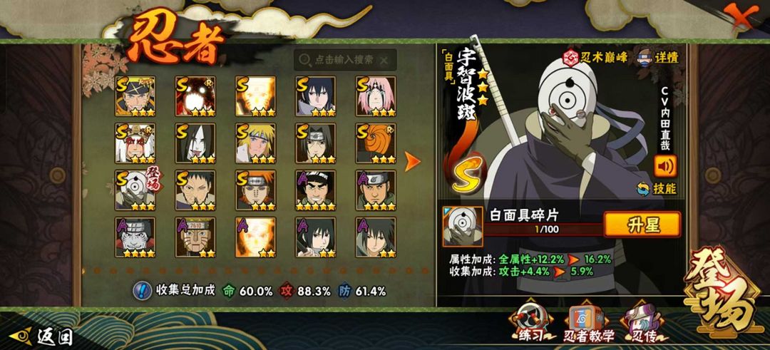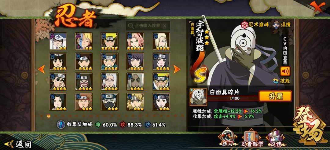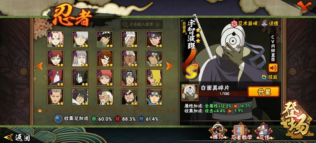 主流S忍白面、忍战带土、黄猿、紫狗等,多个A忍加双忍法帖忍者等你来玩!