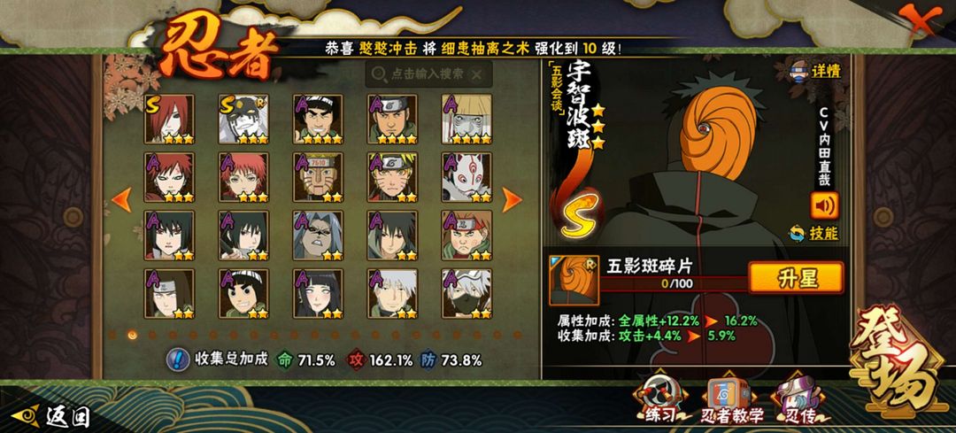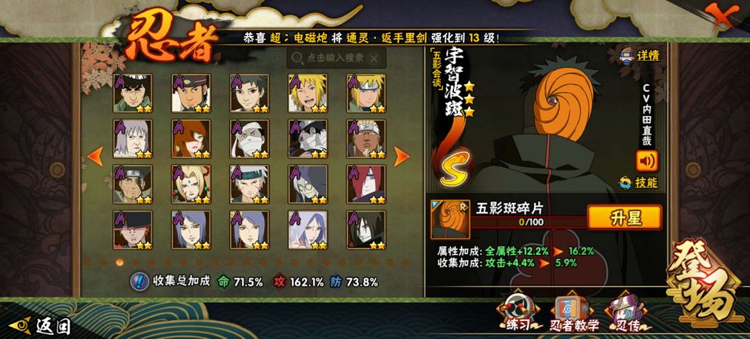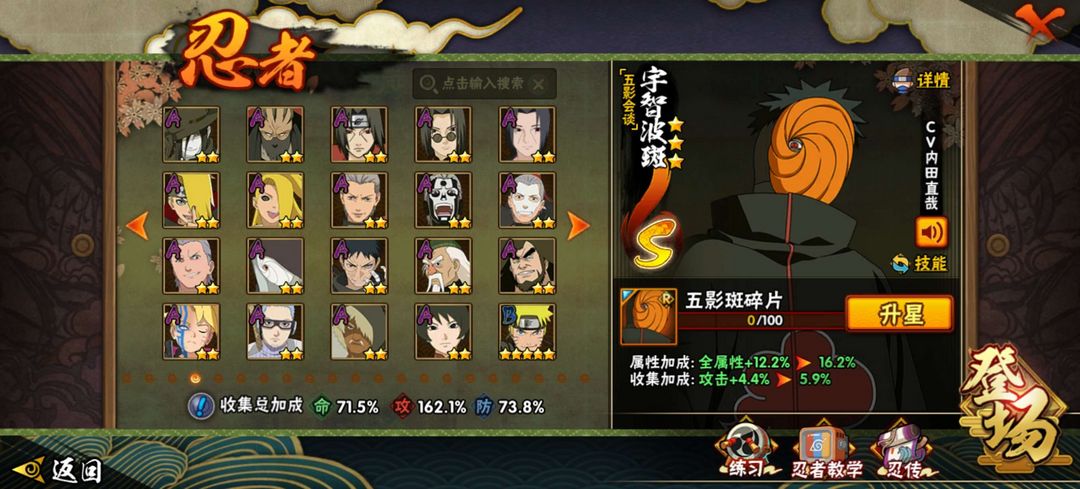 装备描述:V13✨22S✨45A✨创立柱间✨漂泊带土✨五影会谈斑