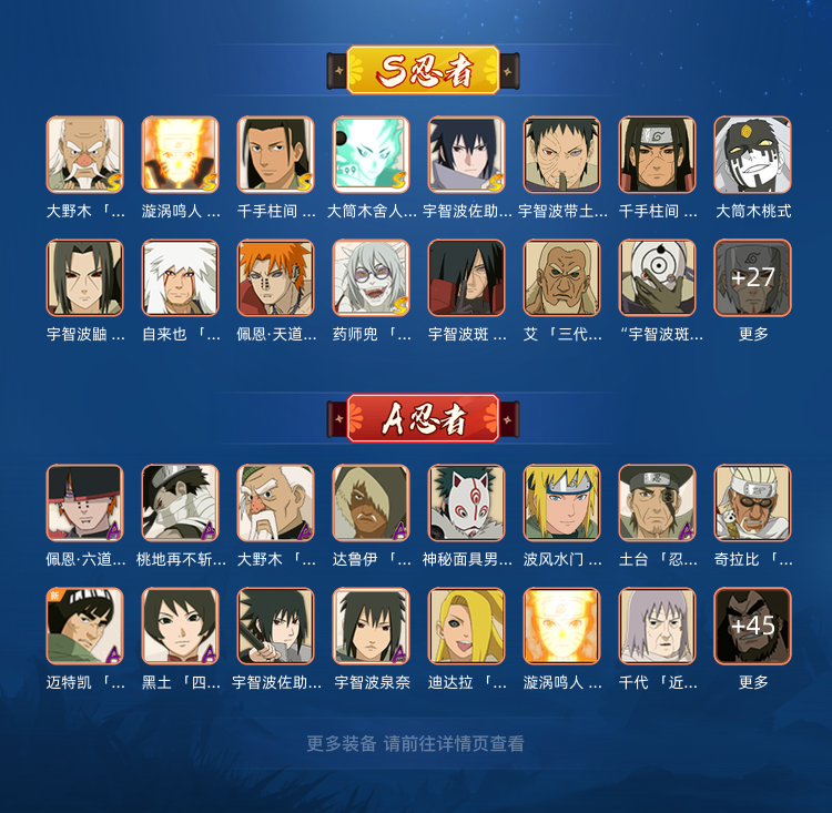 装备描述:三忍自来也✨绯流琥✨须佐卡卡西✨忍战李✨忍战艾✨桃矢显现·博人✨秽土斑·解✨忍战宁次✨永恒佐助