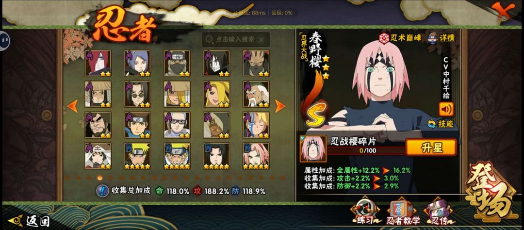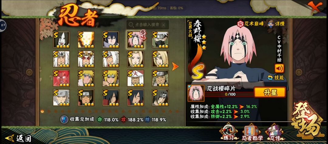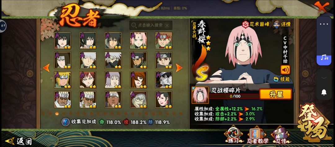 装备描述:忍战带土,新春鼬,天道超,红叶带土,九喇嘛鸣人,忍战小樱,无,山椒鱼,金角银角,漂泊白,七夕卯月夕颜,久级霸体,熊猫,二尾。