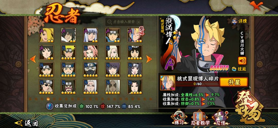 装备描述:1062万战,v10,高招s多,高招a基本全有,暴怒小豪忍战卡卡西须佐止水,有熊猫大象