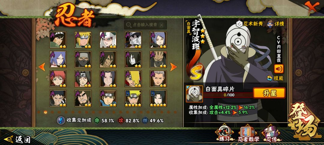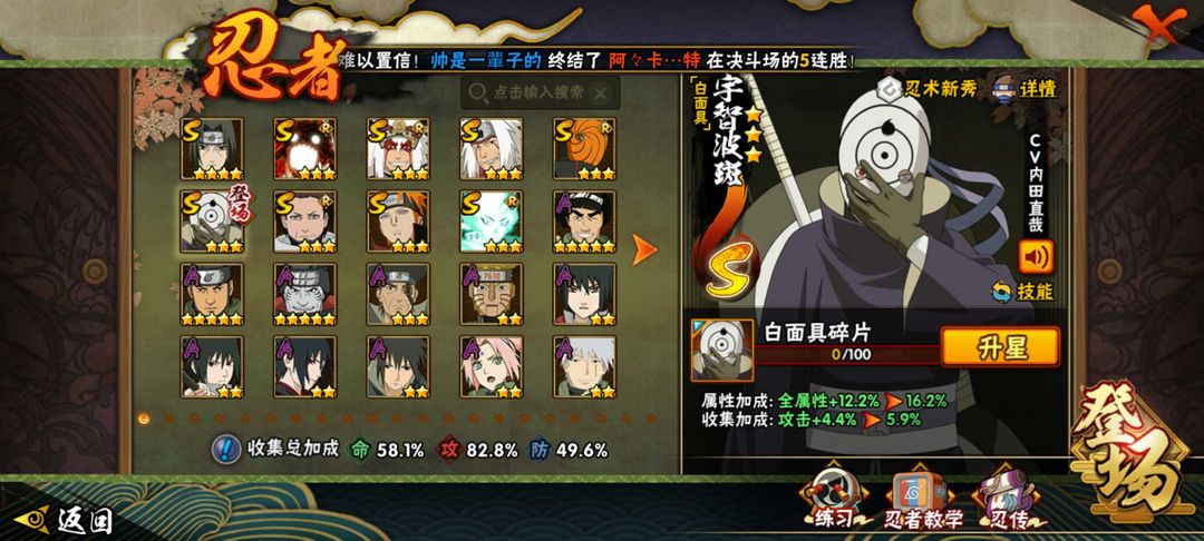 舍人,五影带土,白面具,六尾鸣人,侠隐佐助,漂泊小南,夏日鼬,漂泊带土,战力880w,雪山场景