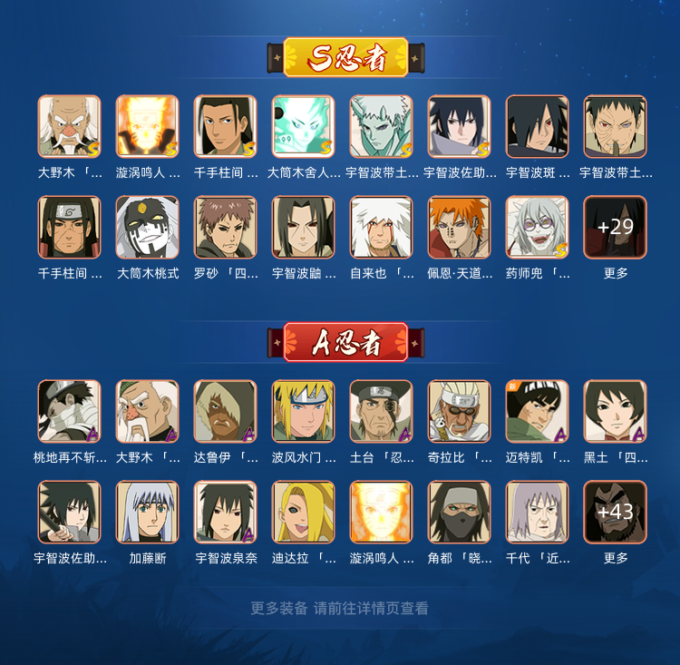 装备描述:46S60A,十尾带土,漂泊带土 侠影佐助(本人),组织限定皮肤全有,鸡翅佐助,天道超,2100w战力,三代风影