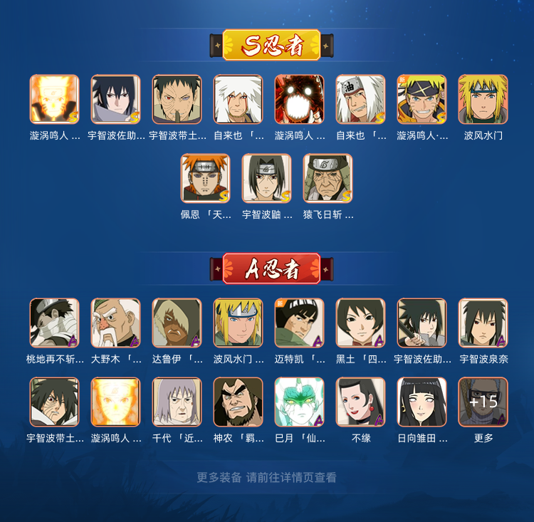 装备描述:11S 31A 秽土三代,漂泊带土,破面带土,永恒佐助,九喇叭连结,暴怒六尾,暴怒带土