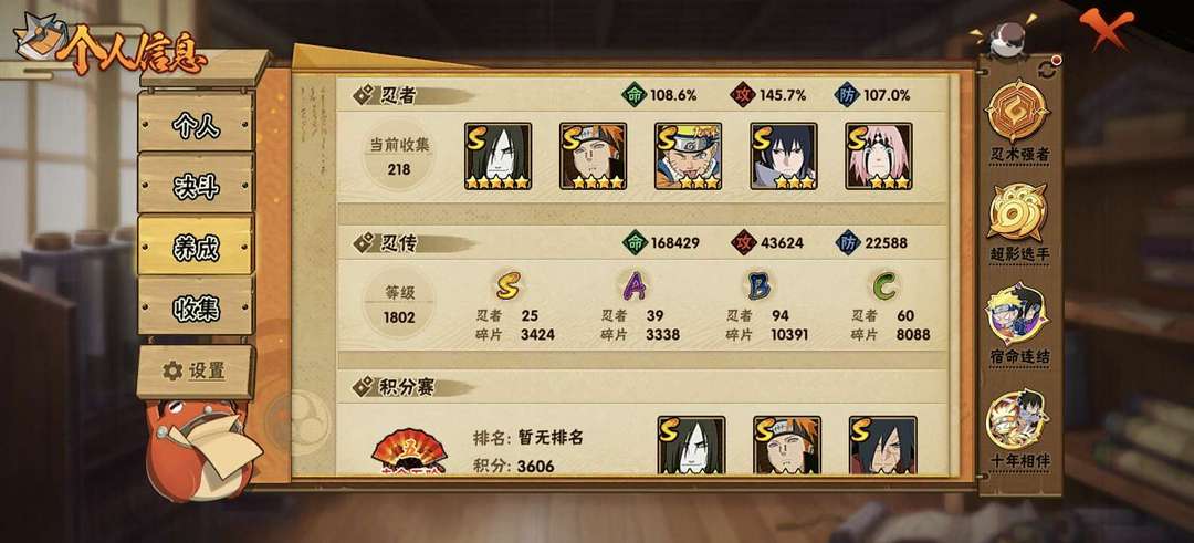 装备描述:25s❤️38a❤️214忍者❤️多198忍者❤️金式❤️桃式❤️漂泊佩恩