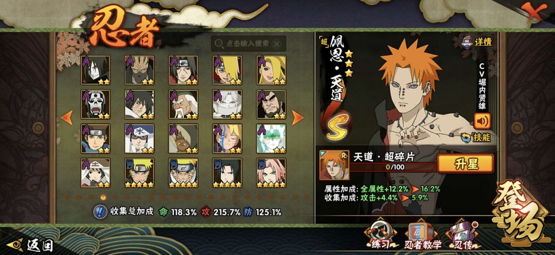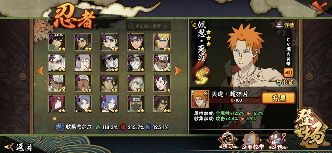 装备描述:40S 56A 258忍忍战带土天道超秽土长门须佐卡卡 西秽土二代 免费通灵兽到老鹰,有熊猫蛞蝓,大部分高招主流忍 者都有,忍者管够玩到爽