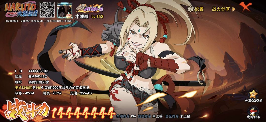 装备描述:31S✨57A✨300忍✨忍战带土✨传说自来也✨仙人巳月✨漂泊再不斩,夏日鼬,妖怪纲手
