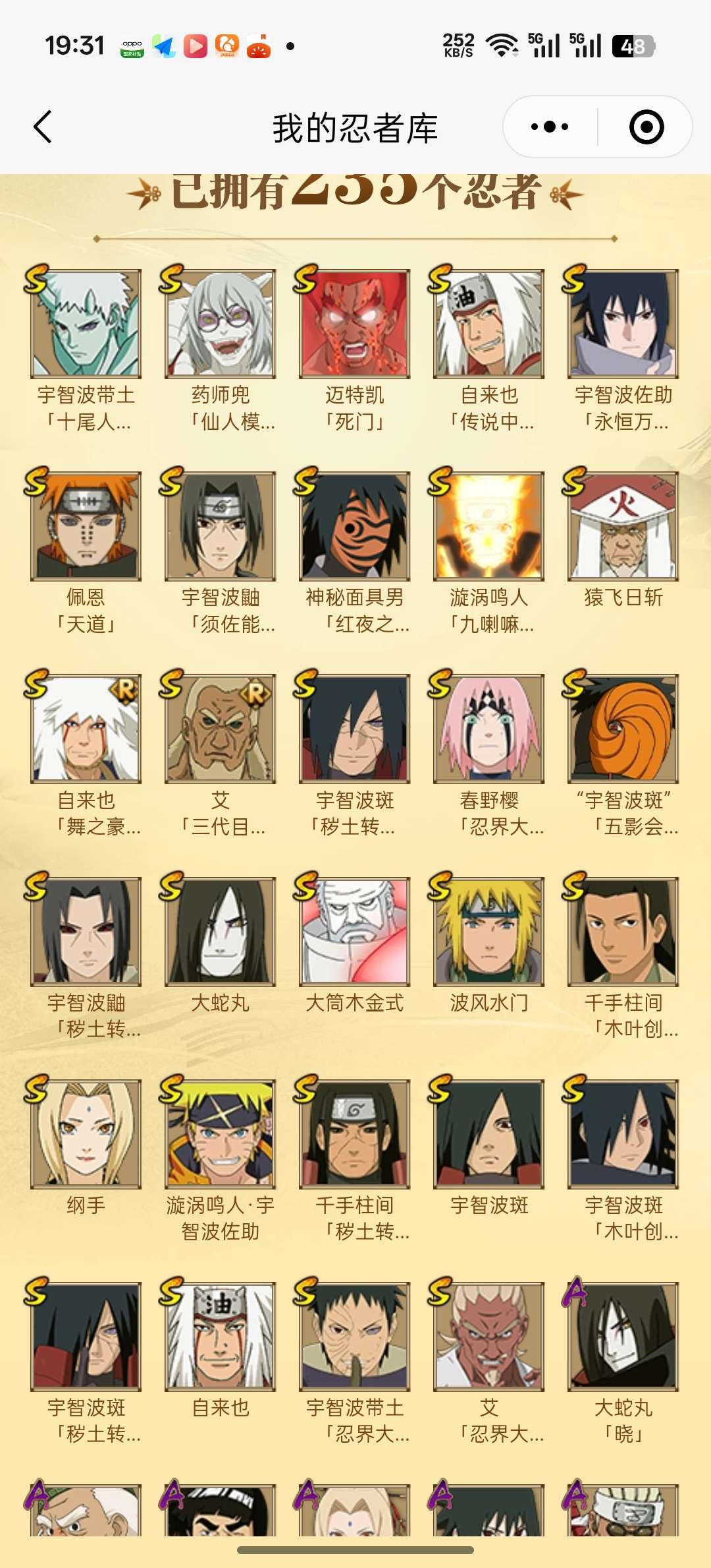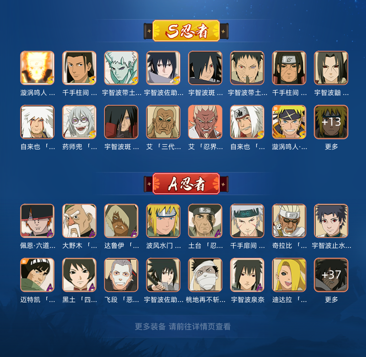 装备描述:30s 52a 1300w战力 十尾带土 传说自来也 黄猿 死门凯 创立班 创立柱间 杀人犯 金式等