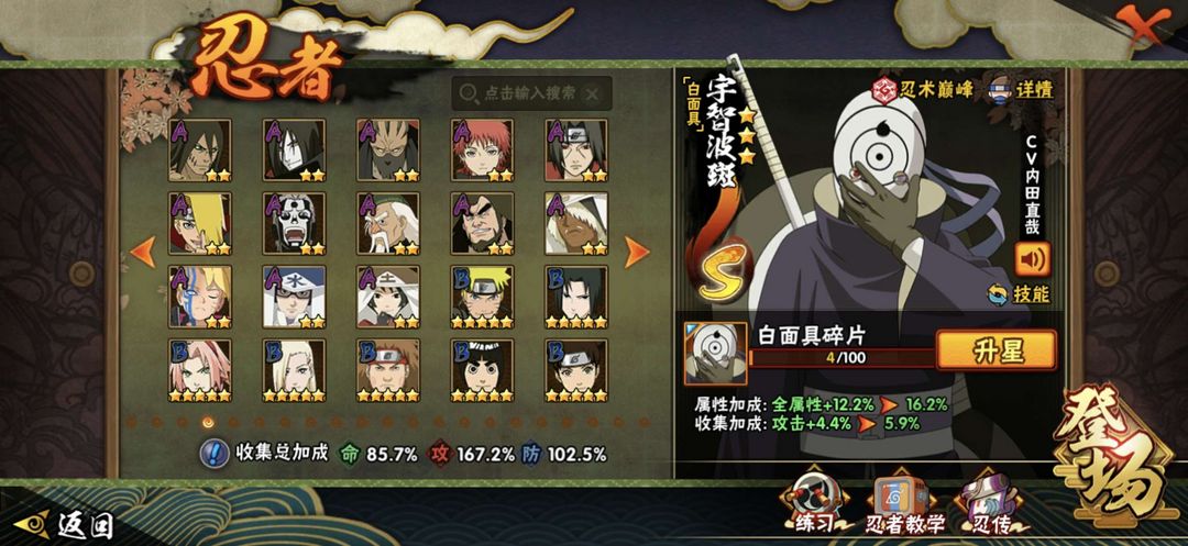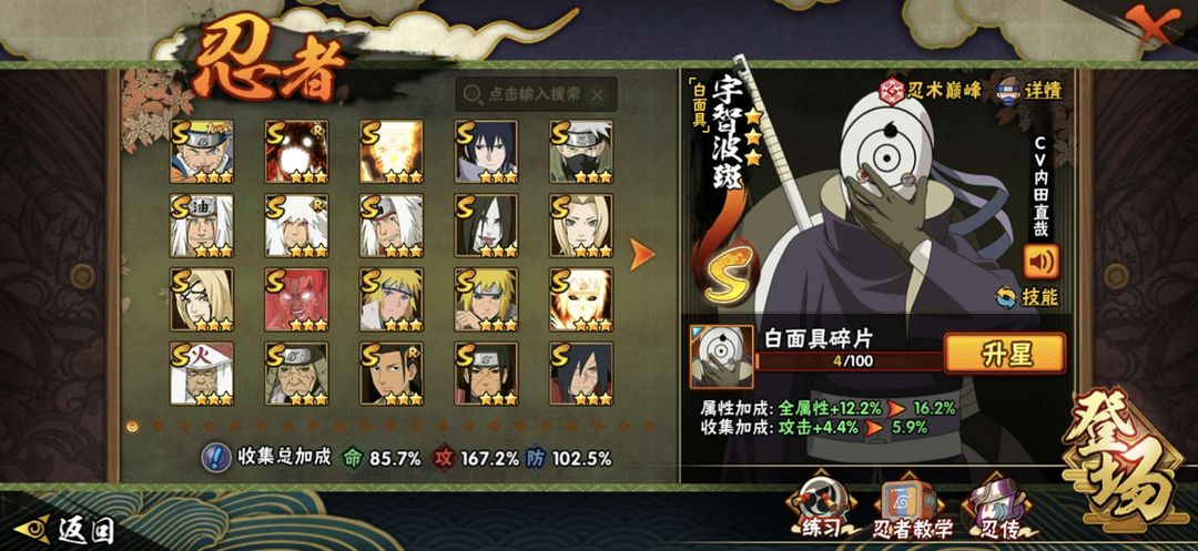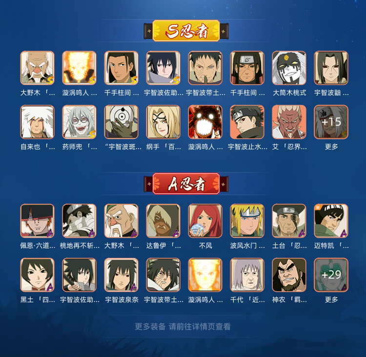 装备描述:32S 45A 203忍 五影带土 漂泊小南 漂泊佩恩 六尾鸣人 创立柱间 红面白面 大筒木桃式
