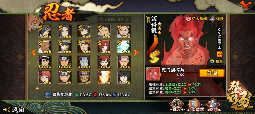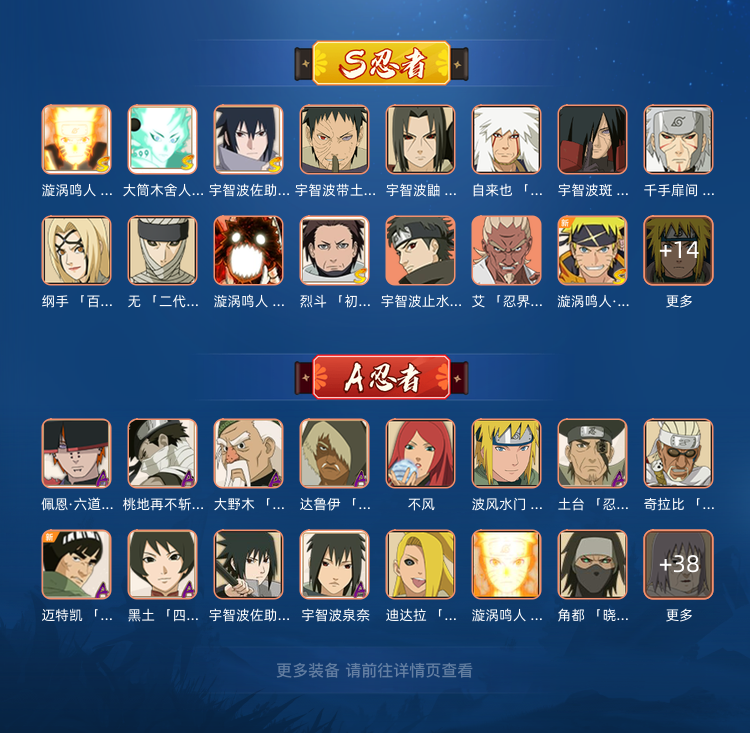 30S、50A。须佐止水、无、漂泊佩恩、新春鼬、六尾鸣、咒印佐助