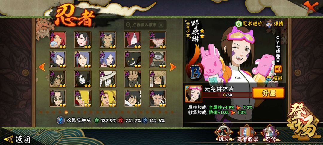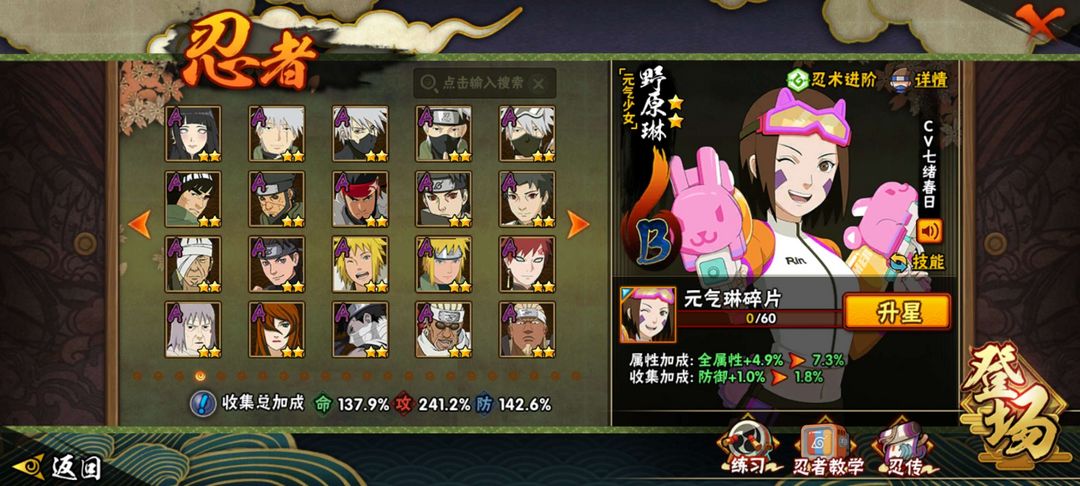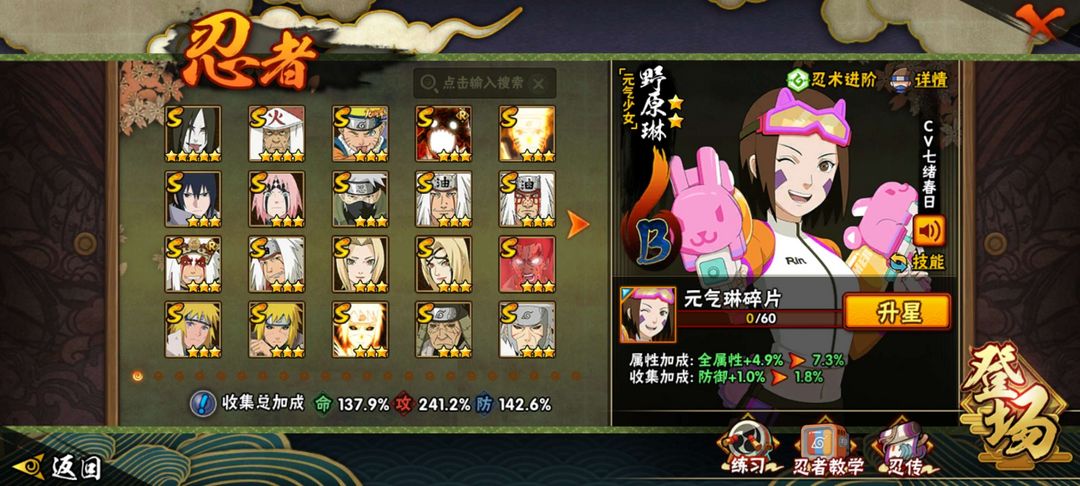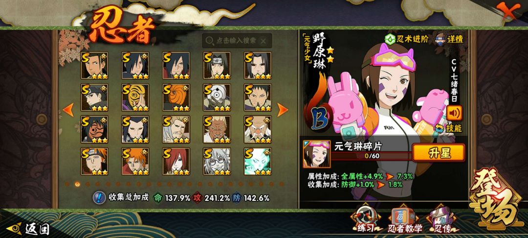 40多个S忍,60多个A忍,通灵有熊猫,秘卷有大部分氪金秘卷,包含大部分氪金忍者,物有所值
