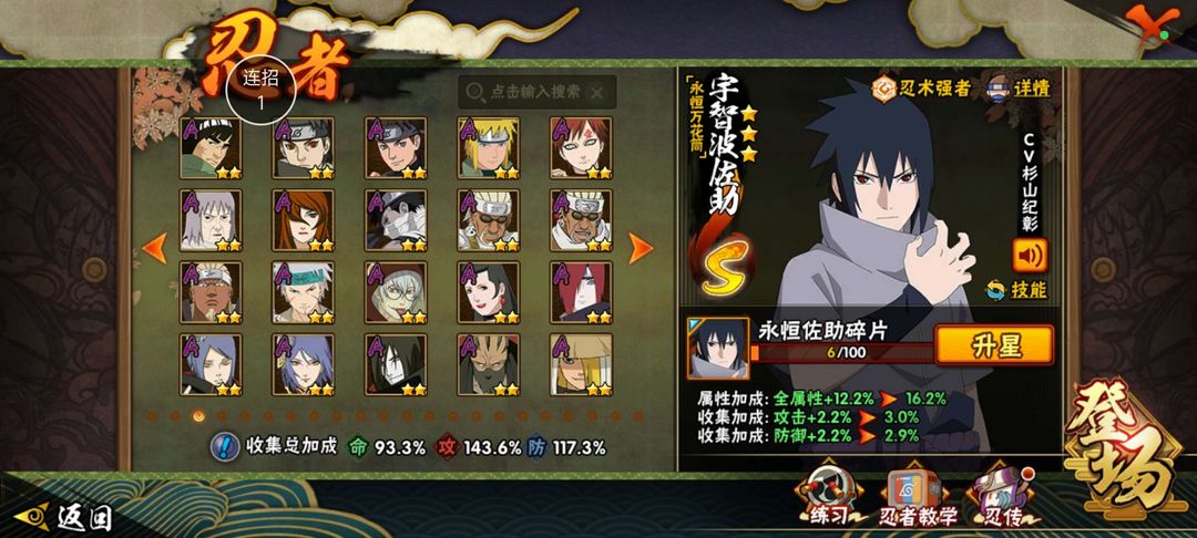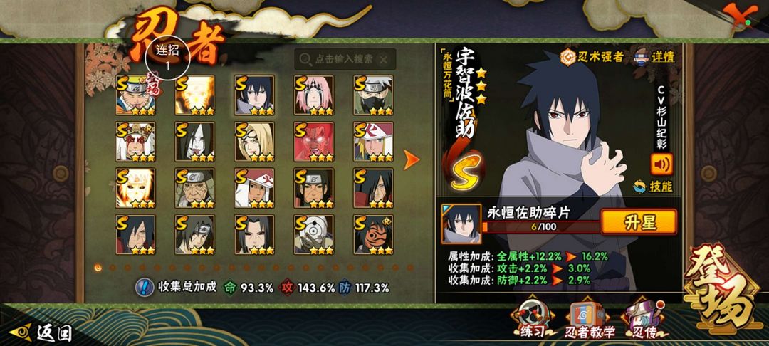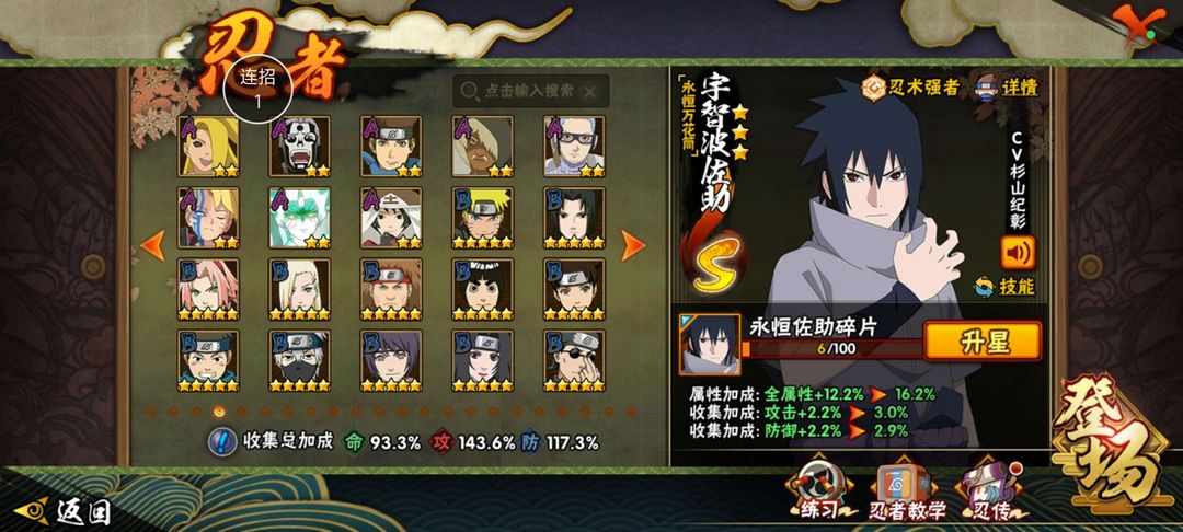装备描述:22s♥46a♥219忍♥红夜带土♥漂泊扉间♥鸡翅佐助♥金身水门♥永恒万花筒佐助